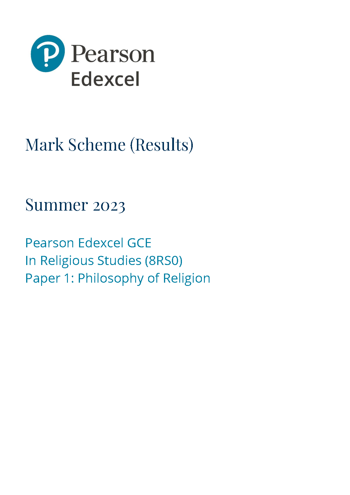 PEARSON EDEXCEL AS Religious Studies PAPER 1 2023 MARK SCHEME (8RS0/01: Philosophy of Religion). DOWNLOAD OFFICIAL AND VERIFIED EDEXCEL PEARSON AS Religious Studies PAPER 1 2023 on www.hackedexams.com INSTANTLY.