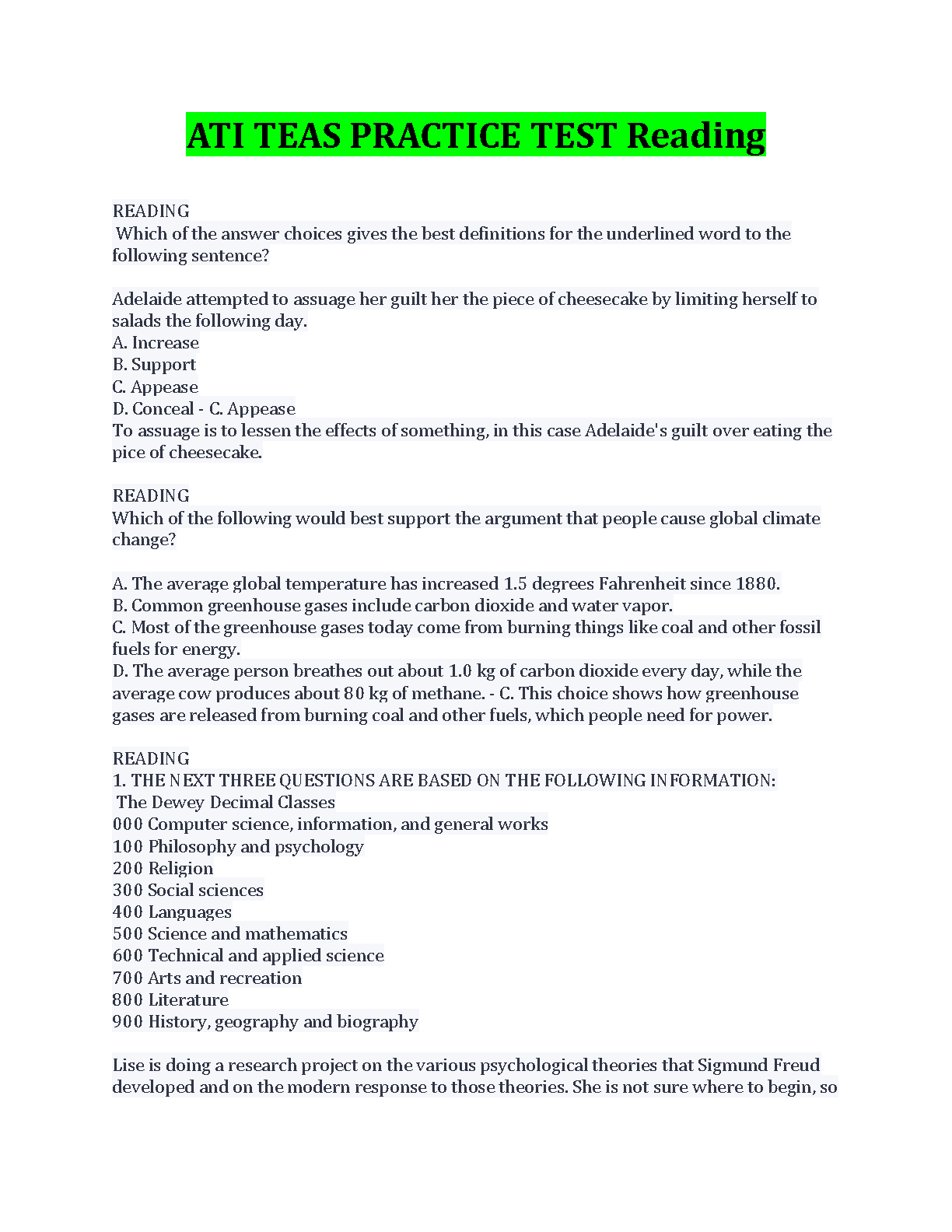 ATI TEAS PRACTICE TEST Reading STUDYGUIDE UPDATED 2023