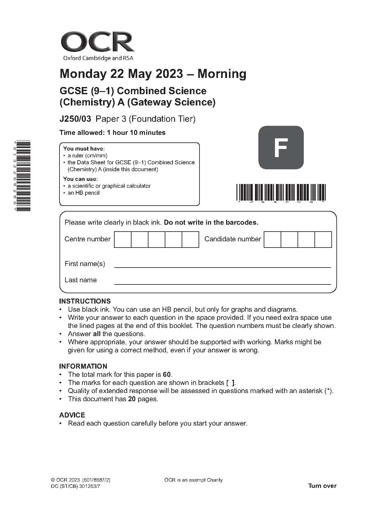 OCR GCSE COMBINED SCIENCE CHEMISTRY A PAPER 3 2023 (J250/03: Foundation Tier)