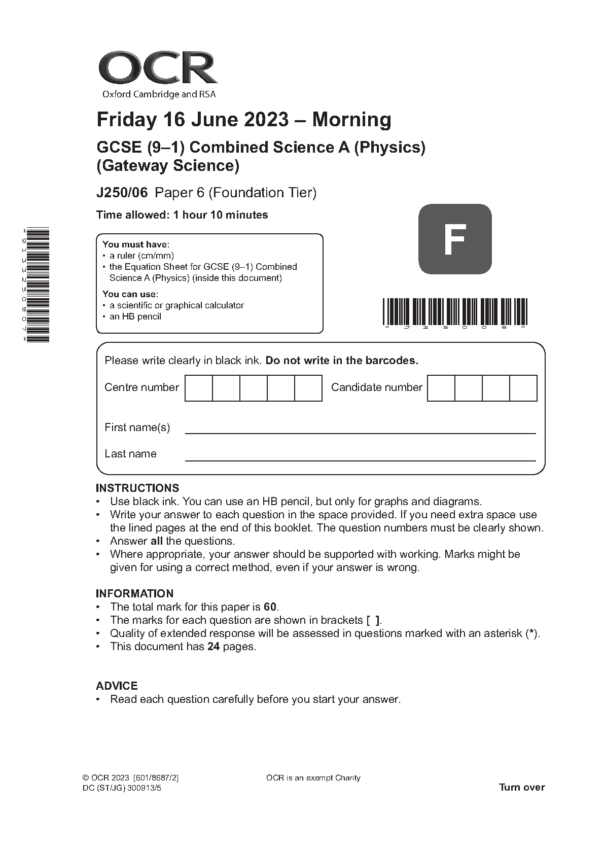 OCR GCSE COMBINED SCIENCE PHYSICS A PAPER 6 2023 (J250/06: Foundation Tier)