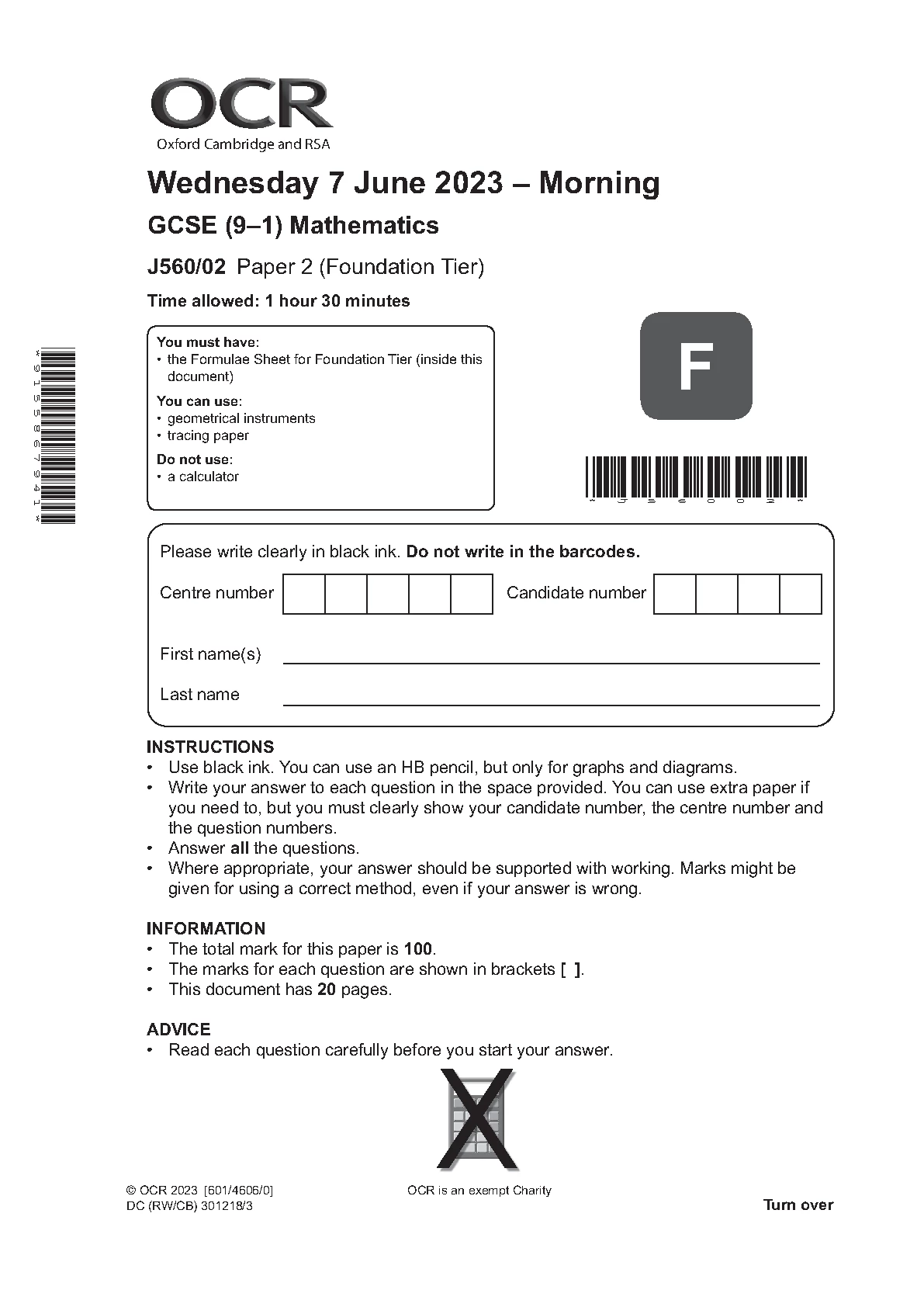 OCR GCSE MATHEMATICS PAPER 2 2023 (J560/02: Foundation Tier)