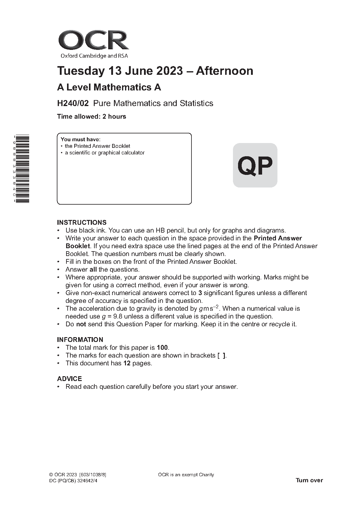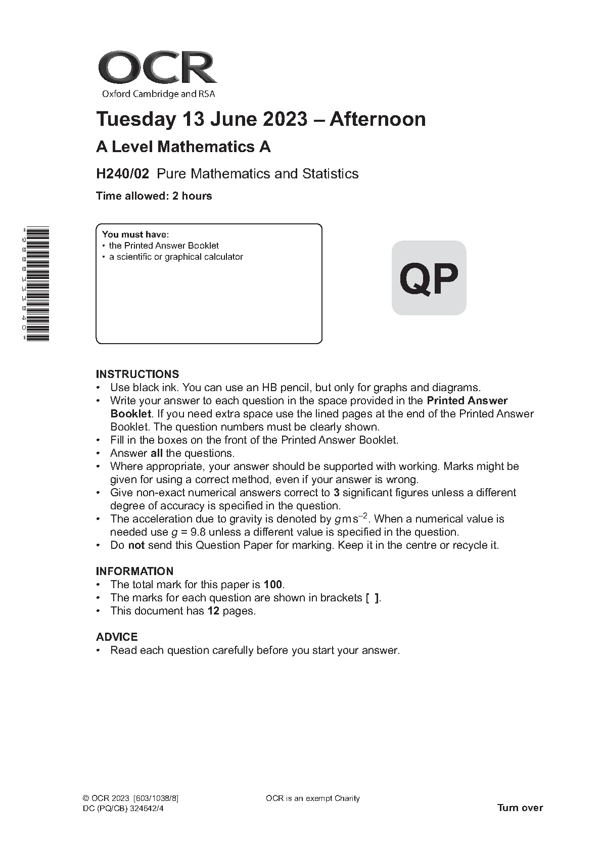 OCR A LEVEL Mathematics A PAPER 2 2023 (H240/02: Pure Mathematics and Statistics)