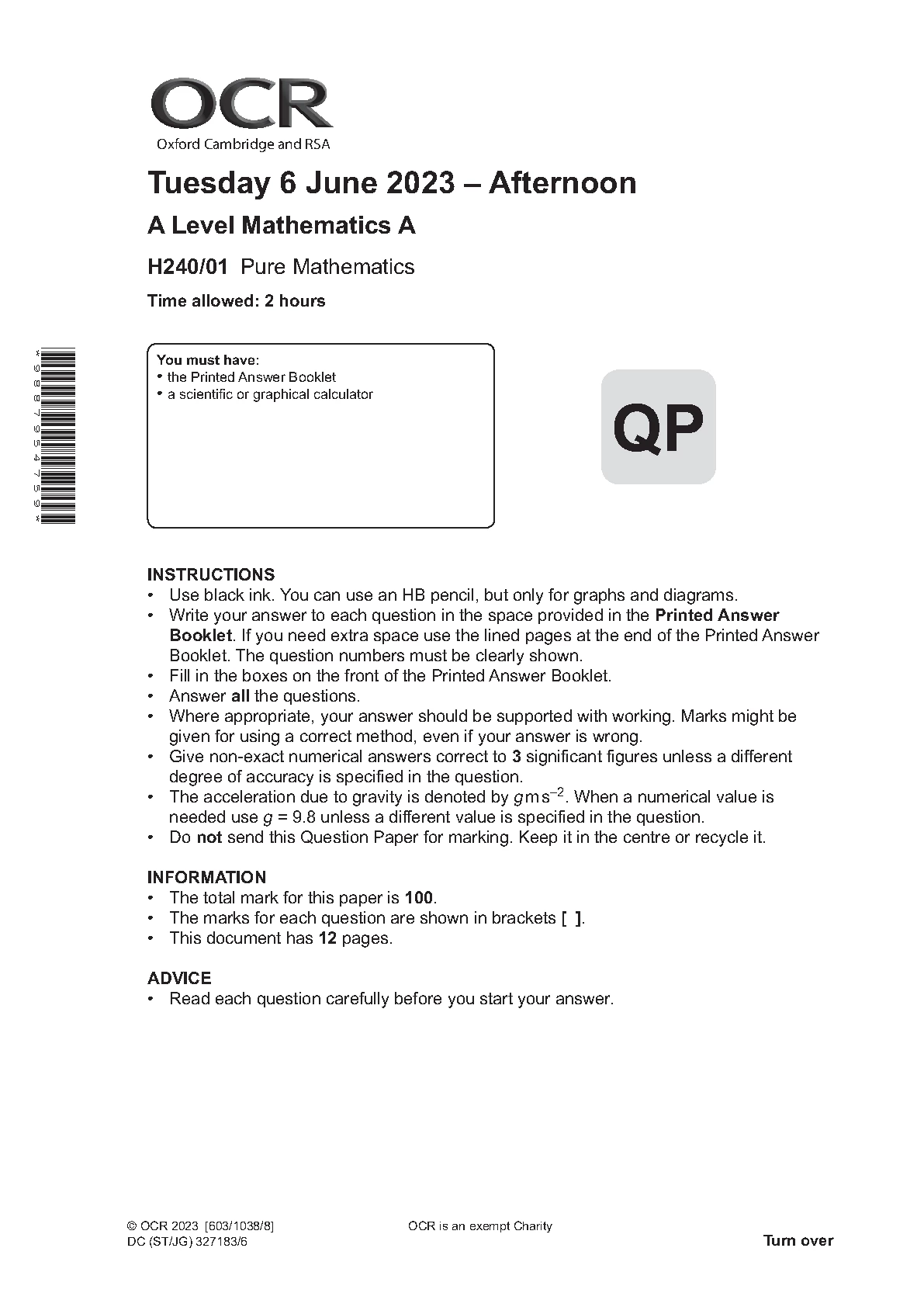 OCR A LEVEL Mathematics A PAPER 1 2023 (H240/01: Pure Mathematics)