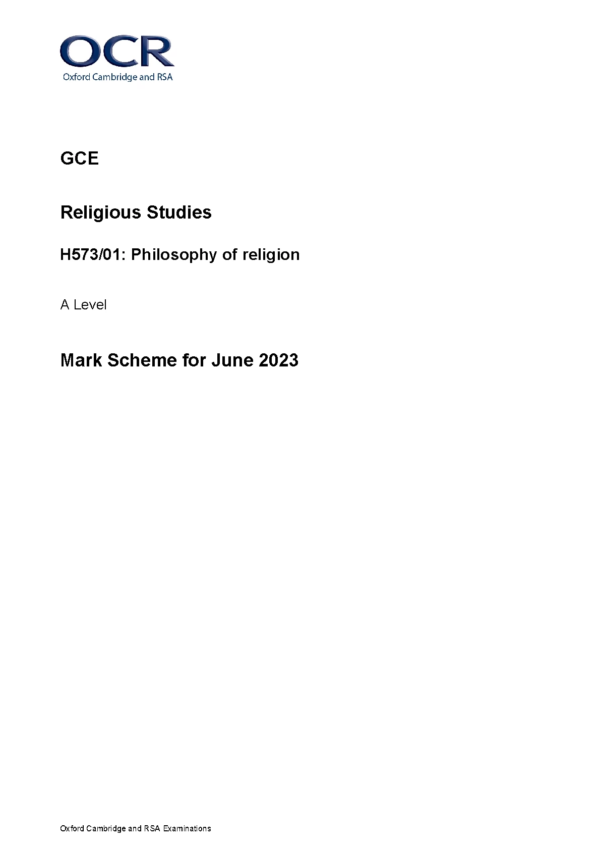 OCR A Level Religious Studies PAPER 1 2023 MARK SCHEME (H573/01: Philosophy of Religion)