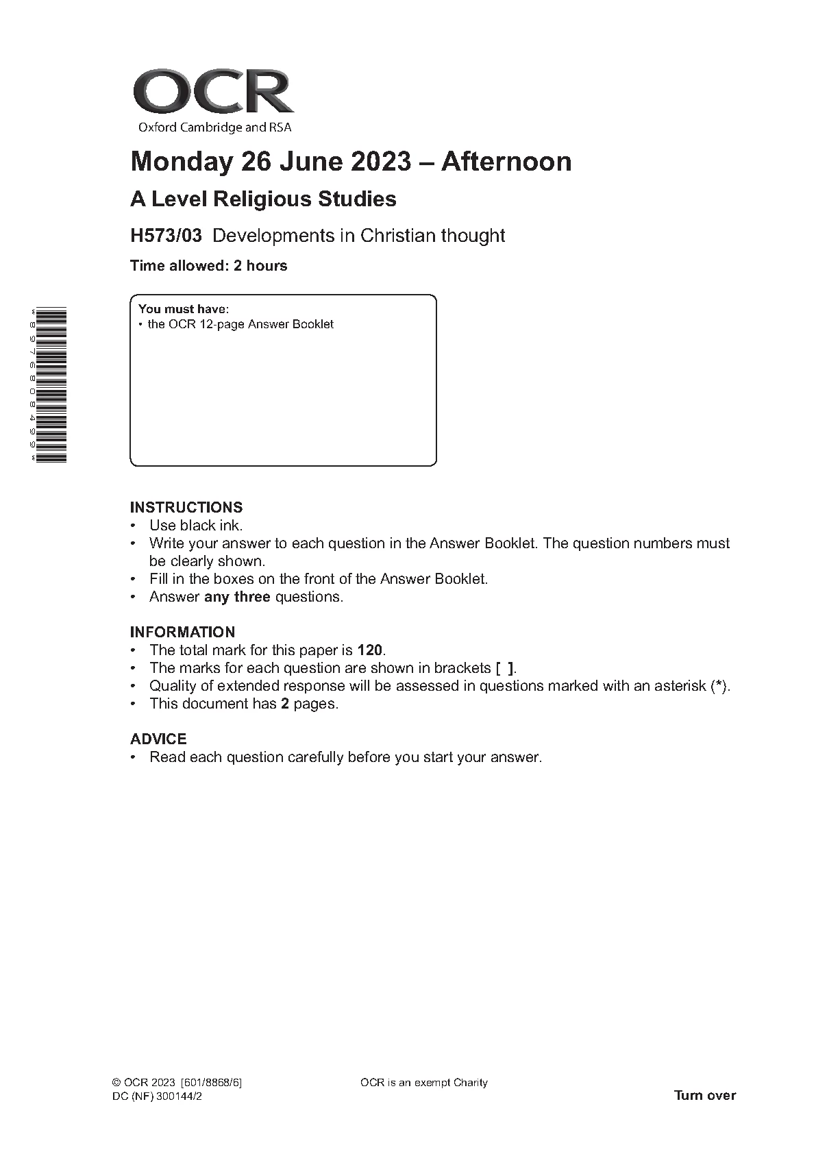 OCR A Level Religious Studies PAPER 3 2023 (H573/03: Developments in Christian thought)