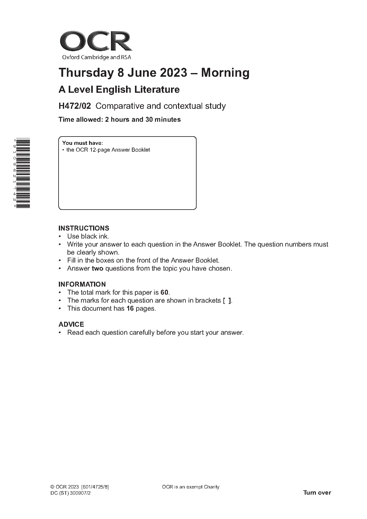 OCR A Level English Literature PAPER 2 2023 (H472/02: Comparative and contextual study)