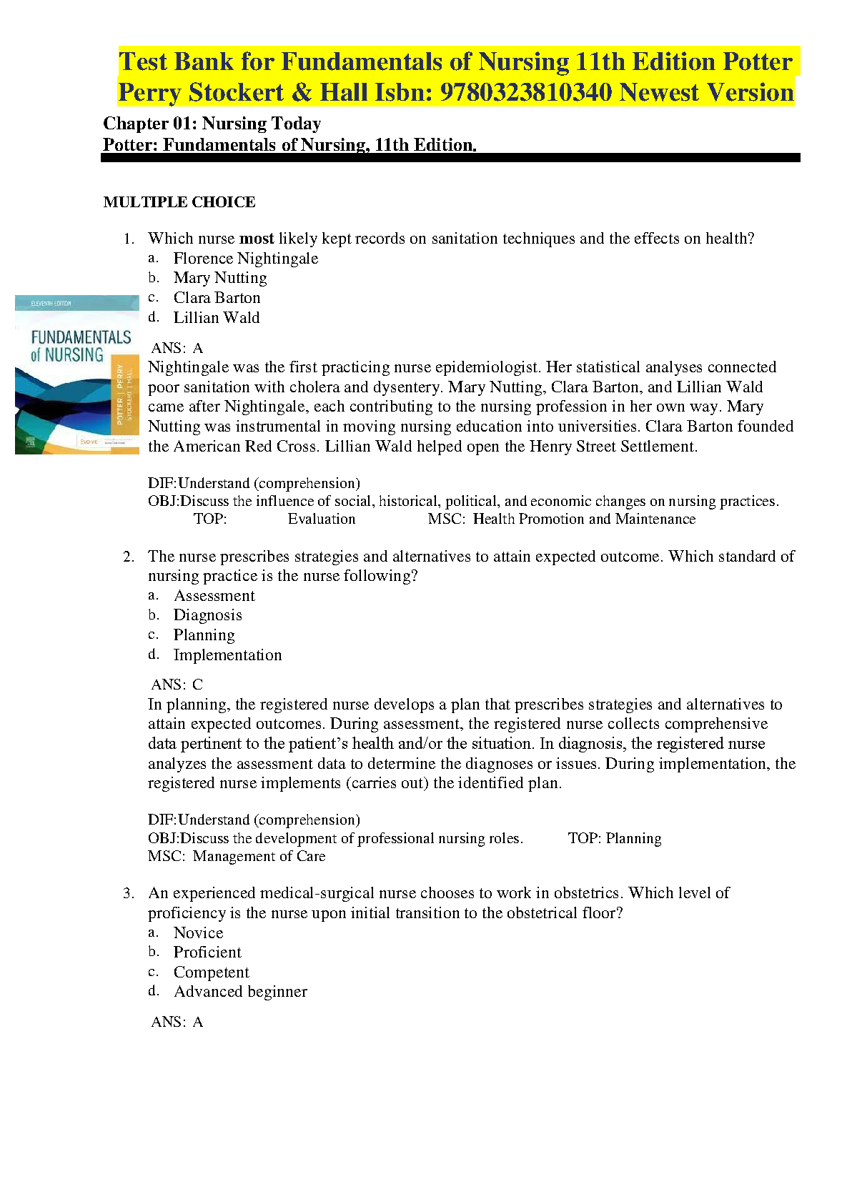 Test Bank for Fundamentals of Nursing 11th Edition BY Potter Perry Stockert & Hall Isbn: 9780323810340 Newest Version