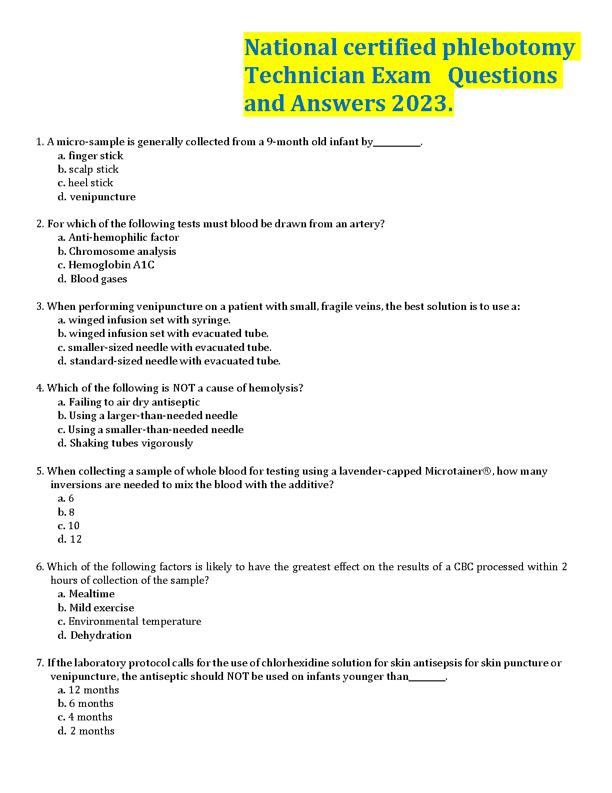 National certified phlebotomy Technician Exam Questions and Answers 2023.
