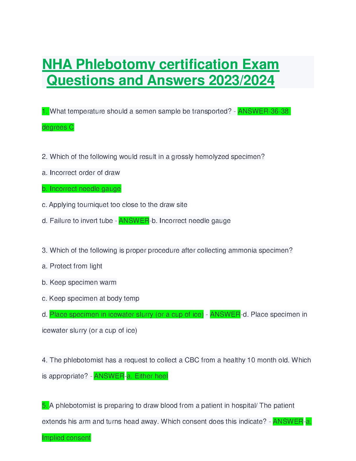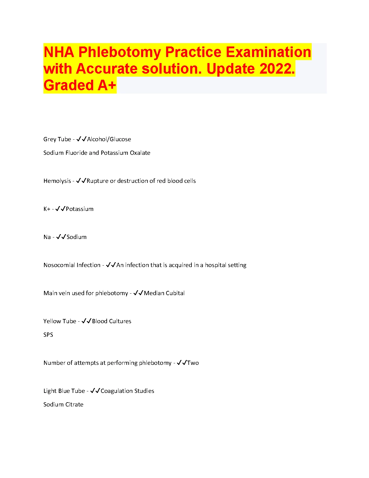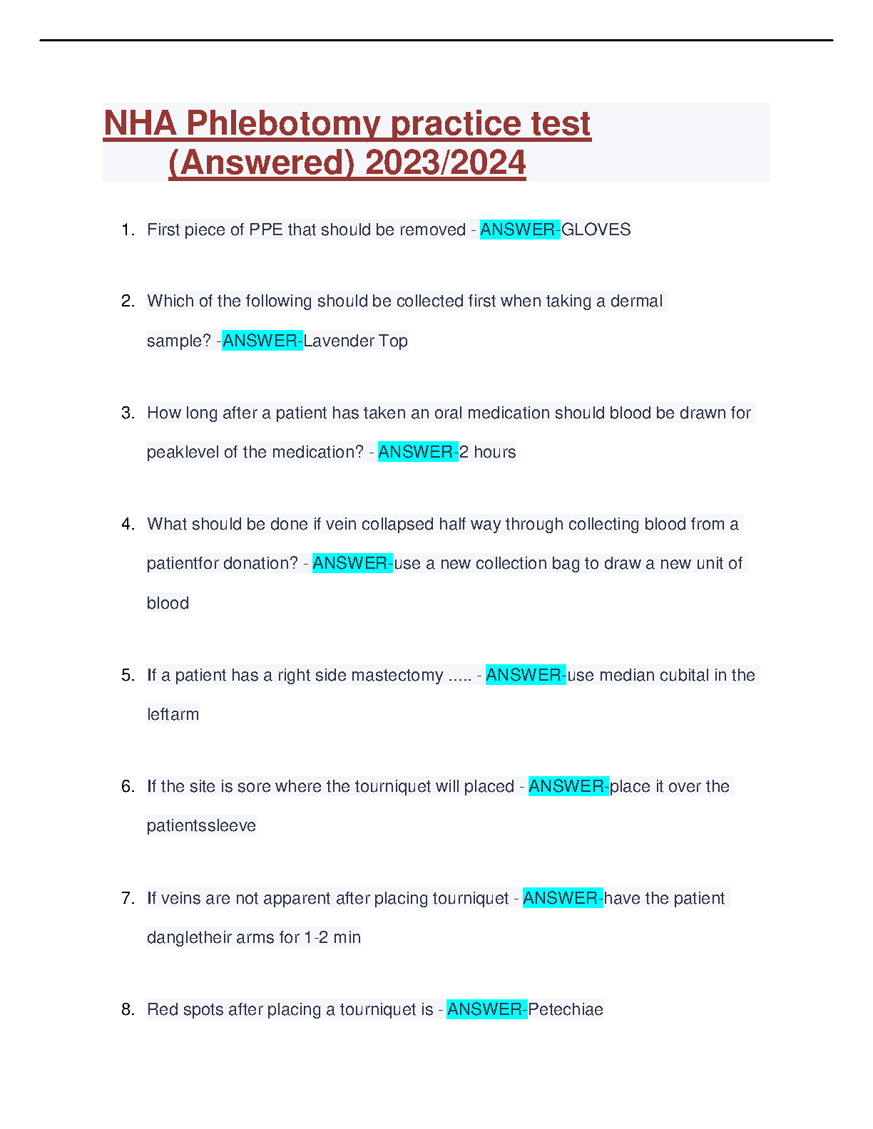 NHA Phlebotomy practice test (Answered) 2023/2024. DOWNLOAD on www.hackedexams.com INSTANTLY.