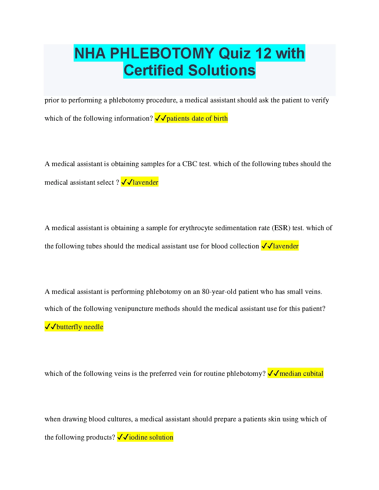 NHA Phlebotomy Certification EXAM 2023/2024 $16.00 NHA Phlebotomy certification EXAM 2023/2024 $16.00 TEST BANK FOR NHA Phlebotomy (1) (+140 Questions and Answers) COMPLETE SOLUTION LATEST UPDATE $18.00 NHA Phlebotomy Exam with Complete Solutions 2023 $16.00 NHA PHLEBOTOMY (2022/2023) QUESTIONS AND ANSWERS RATED A+ $16.00 NHA Phlebotomy certification EXAM/Phlebotomy NHA Certification Questions With Complete Solutions |Verified| 2023 $16.00 NHA Phlebotomy - Study Guide - Part 2 NEW SOLUTION $16.00 NHA Phlebotomy Practice Examination Solution Guide BRAND NEW $16.00 NHA Phlebotomy (Test 3) Questions Answered 100% Correct 2023 |Verified $16.00 NHA Phlebotomy Exam Questions and Answers 2023 $16.00 NHA Phlebotomy Exam Questions with Complete Solutions $16.00 NHA Phlebotomy Exam Questions with Complete Solutions RATED A+ $16.00 TEST BANK NHA Phlebotomy (1) (+140 Questions and Answers) $16.00 NHA PHLEBOTOMY NATIONAL EXAM QUESTIONS AND ANSWERS 100% PASS $16.00 NHA Phlebotomy Technician Study Guide 2023 $16.00 NHA Phlebotomy Study Guide - Pt 1 Questions with Correct Answers RATED A+ $16.00 NHA Phlebotomy Practice Examination with Accurate solution. LATEST UPDATE. Graded A+ $16.00 NHA Phlebotomy certification Exam Questions and Answers 2023/2024 $16.00 NHA PHLEBOTOMY Quiz 12 with Certified Solutions BRAND NEW 2023 $16.00 NHA Phlebotomy practice test (Answered) 2023/2024 $16.00 NHA Phlebotomy Study Guide Questions with Correct Answers 100% CORRECT AND VERIFIED $16.00 NHA phlebotomy test Questions Solved Correctly 100% |Verified $16.00 NHA Phlebotomy Exam Questions and Answers 2023 $16.00 NHA Phlebotomy Exam 2/Phlebotomy NHA Exam 2 Questions Solved 100% Correct 2023 |Verified $16.00 NHA phlebotomy (Test 4) Questions Answered 100% Correct 2023 |Verified $16.00 NHA Phlebotomy Exam Questions with Correct Answers/ Latest SOLUTION $16.00 NHA Phlebotomy Patient Preparation Questions and Answers 100% Complete $16.00 NHA PHLEBOTOMY CERIFICATION EXAM VERIFIED QUESTIONS AND ANSWERS GRADED A+ LATEST 2023/2024 $16.00 NHA Phlebotomy (Test 6) Questions Answered 100% Correct |Verified $16.00 NHA Phlebotomy (Test 7) Questions Answered 100% Correct |Verified $16.00