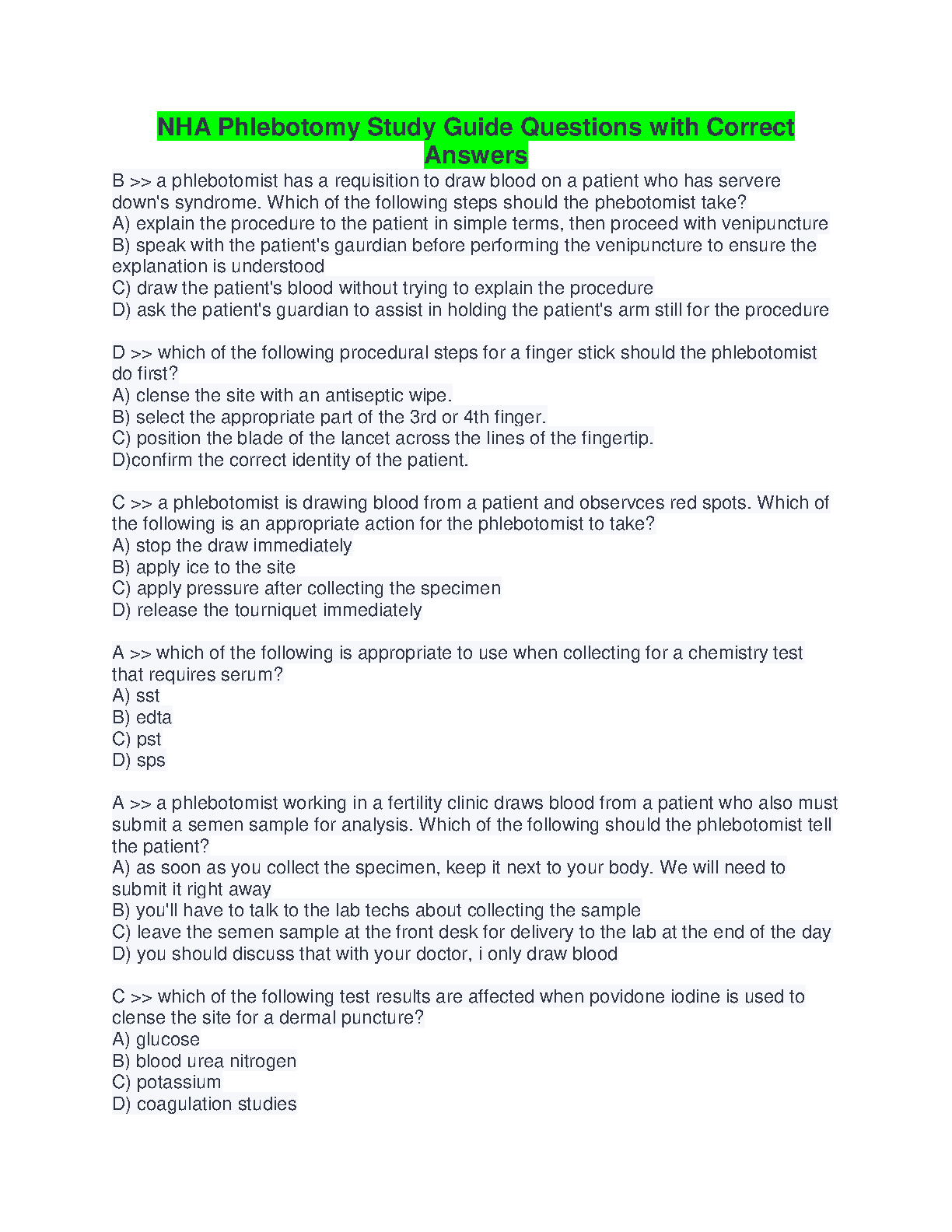NHA Phlebotomy Study Guide Questions with Correct Answers 100% CORRECT AND VERIFIED. DOWNLOAD on www.hackedexams.com INSTANTLY.