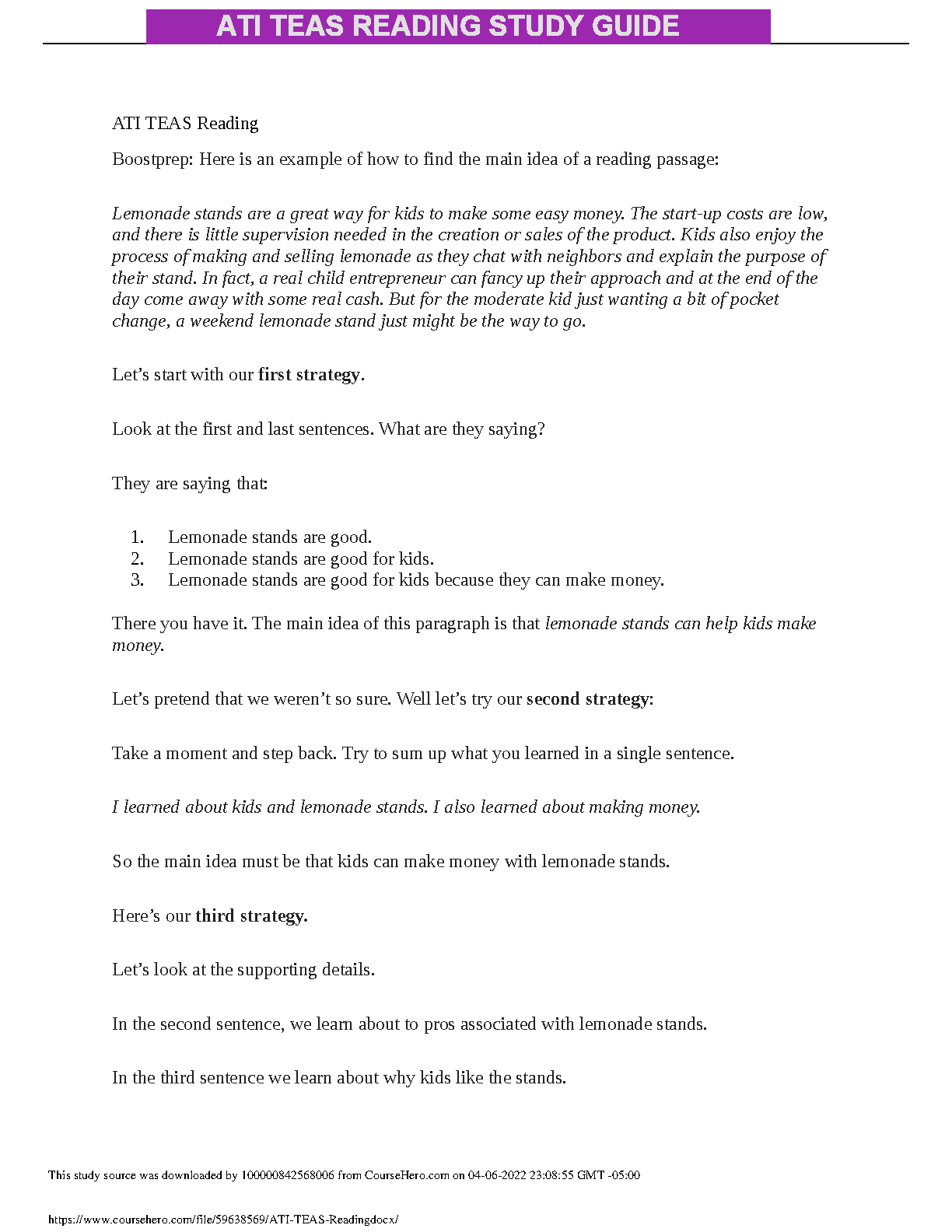 ATI TEAS READING STUDY GUIDE RECENT 2023