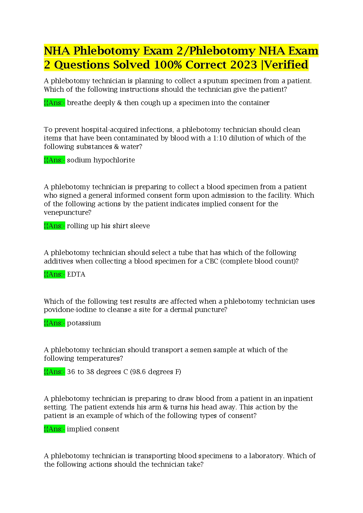 NHA Phlebotomy Exam 2/Phlebotomy NHA Exam 2 Questions Solved 100% Correct 2023 |Verified. DOWNLOAD on www.hackedexams.com INSTANTLY.