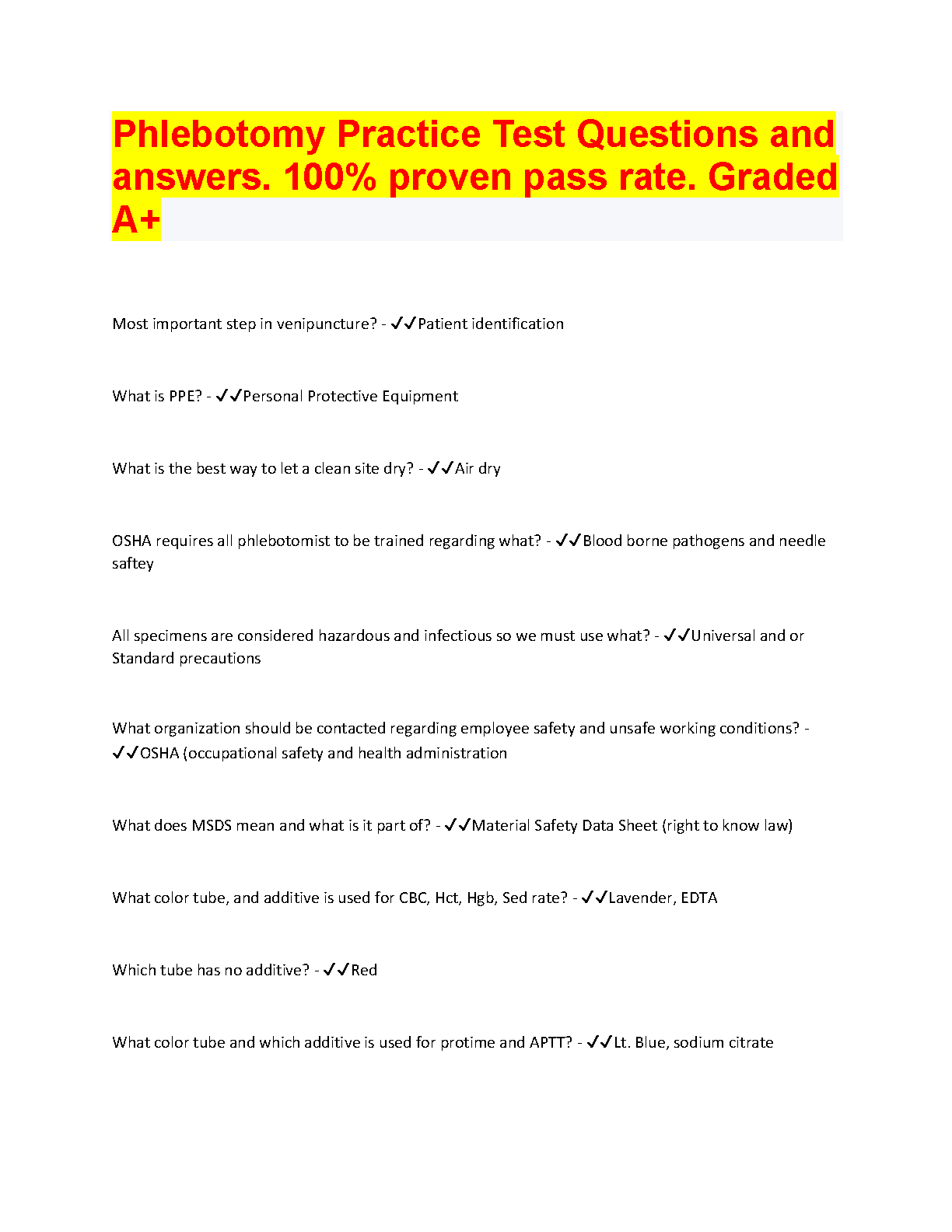 Phlebotomy Practice Test Questions and answers. 100% proven pass rate. Graded A+. DOWNLOAD on www.hackedexams.com INSTANTLY.