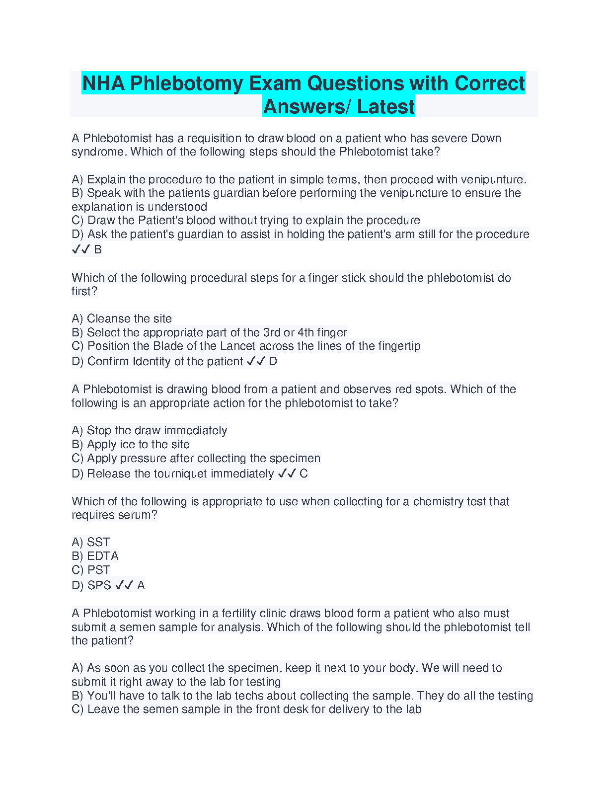 NHA Phlebotomy Exam Questions with Correct Answers/ Latest SOLUTION. DOWNLOAD on www.hackedexams.com INSTANTLY.