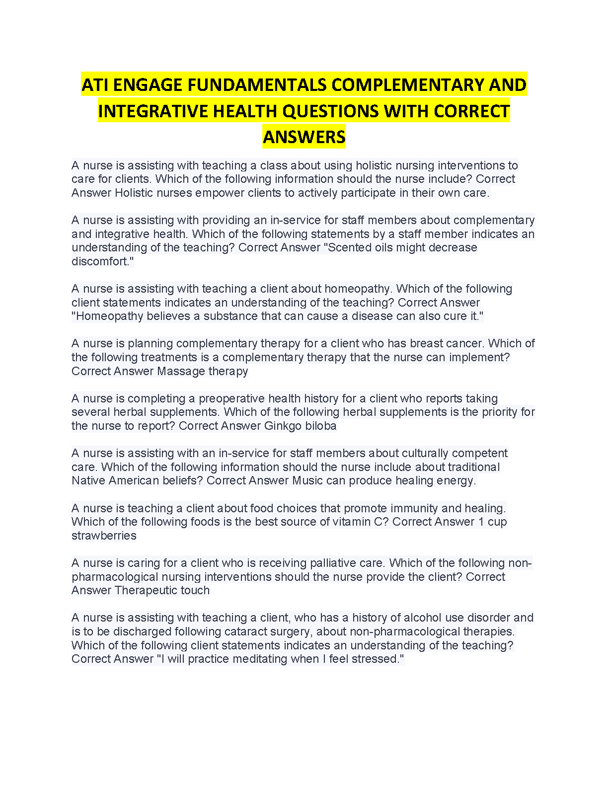 ATI ENGAGE FUNDAMENTALS COMPLEMENTARY AND INTEGRATIVE HEALTH QUESTIONS WITH CORRECT ANSWERS. DOWNLOAD on www.hackedexams.com INSTANTLY.