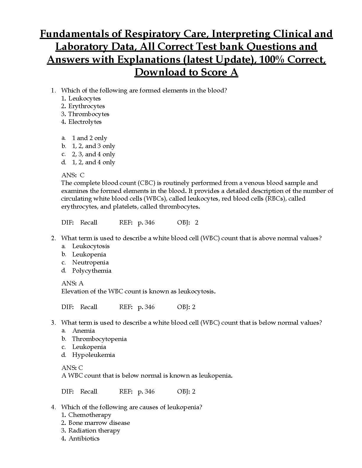 Fundamentals of Respiratory Care, Interpreting Clinical and Laboratory Data, All Correct Test bank Questions and Answers with Explanations (latest Update), 100% Correct