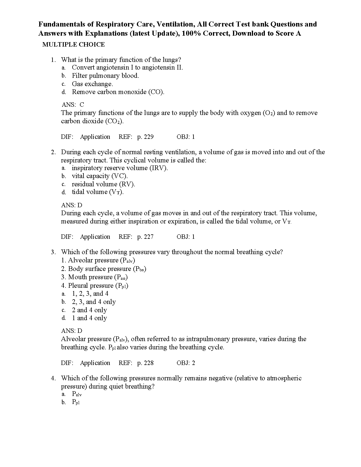 Fundamentals of Respiratory Care, Ventilation, All Correct Test bank Questions and Answers with Explanations (latest Update), 100% Correct,