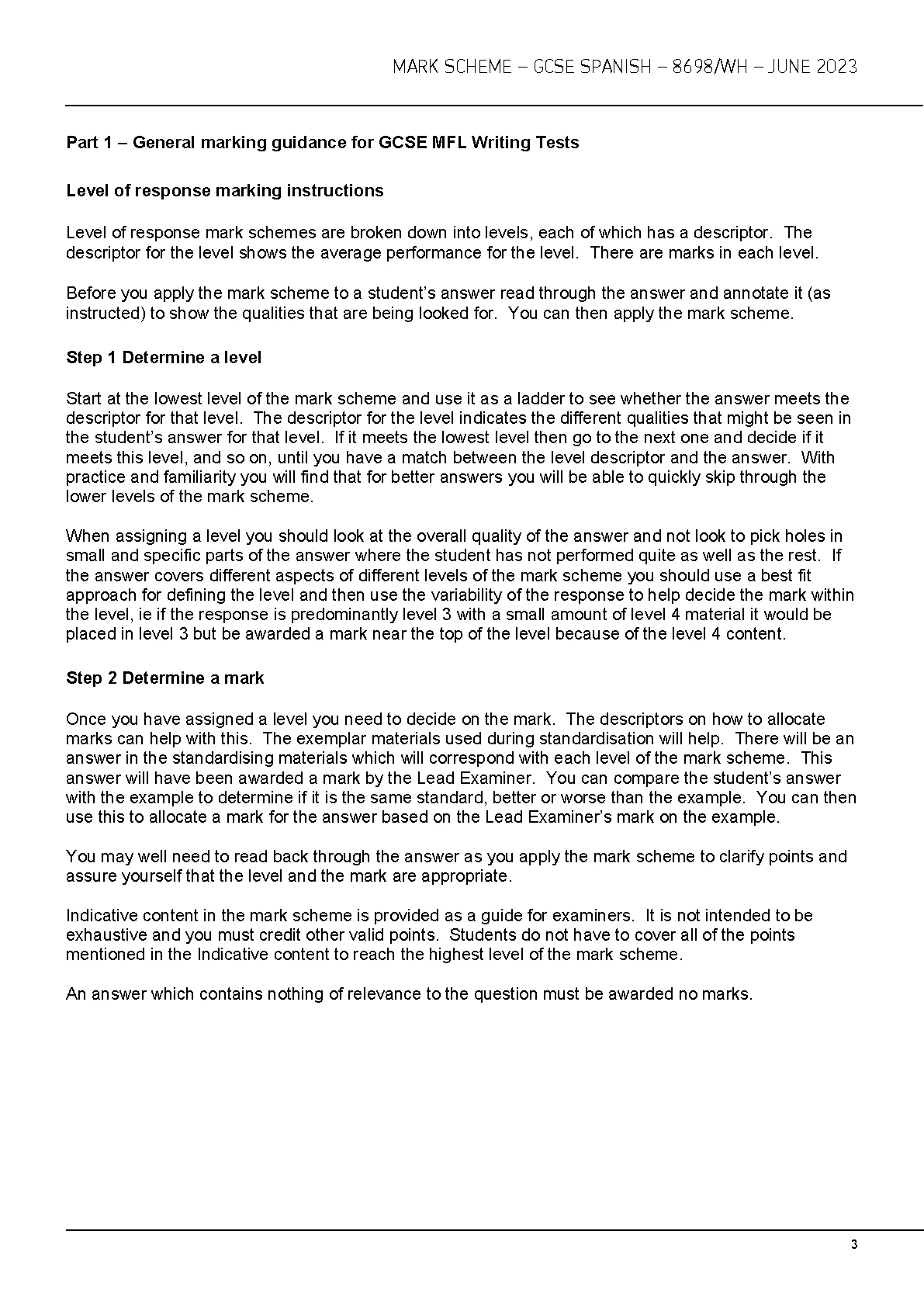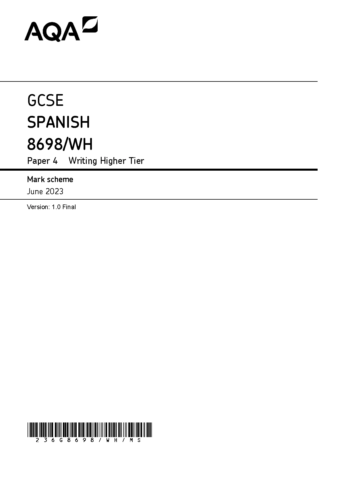 2023 AQA GCSE SPANISH PAPER 4 2023 MARK SCHEME (8698/WF: Writing Higher Tier).