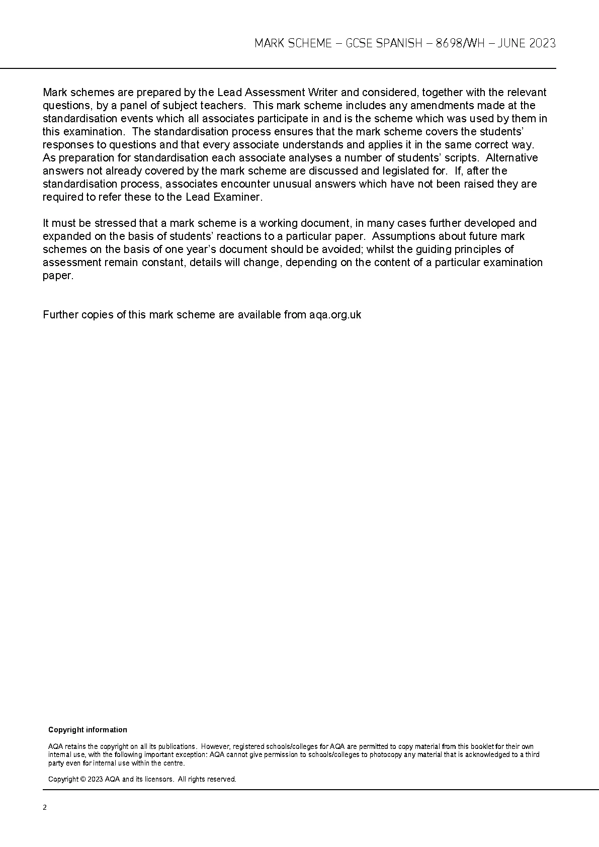 2023 AQA GCSE SPANISH PAPER 4 2023 MARK SCHEME (8698/WF: Writing Higher Tier). DOWNLOAD on www.Hackedexams.com INSTANTLY.