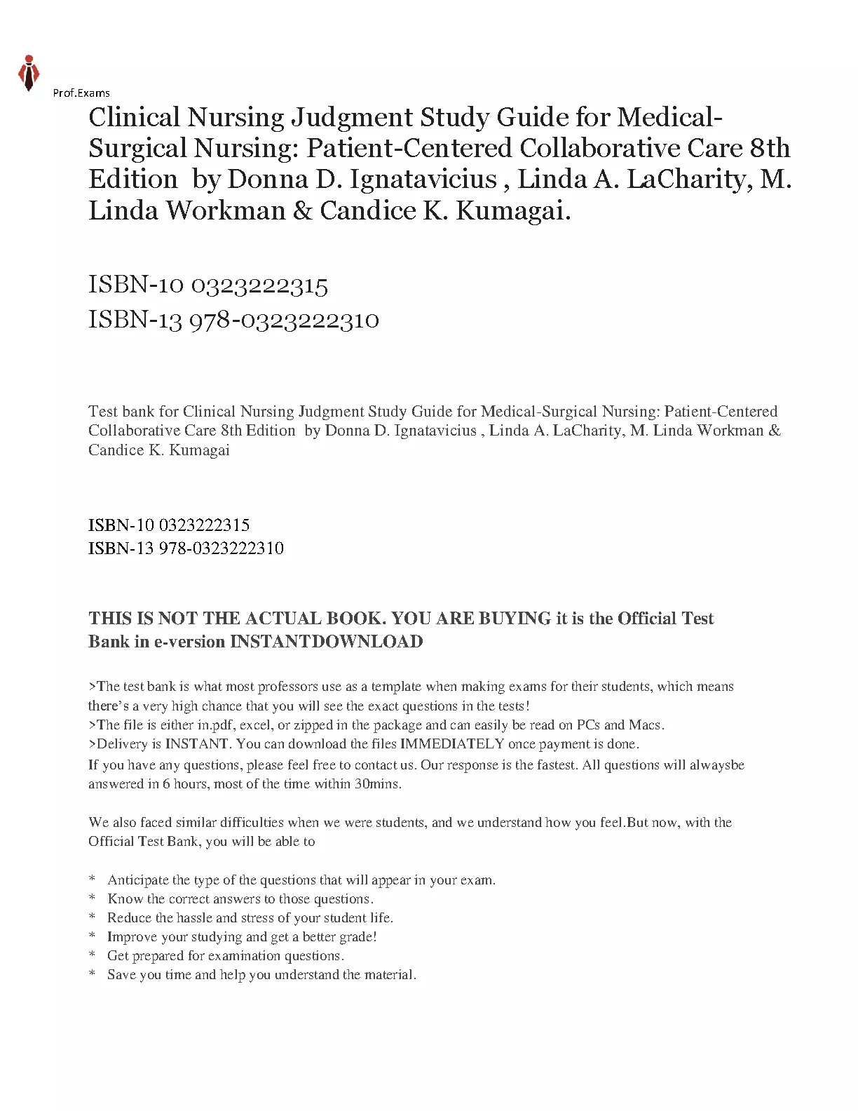 COMPLETE Clinical Nursing Judgment Study Guide for Medical-Surgical Nursing: Patient-Centered Collaborative Care 8th Edition Donna D. Ignatavicius Linda A. LaCharity M. Linda Workman Candice K. Kumagai. DOWNLOAD on www.hackedexams.com INSTANTLY.