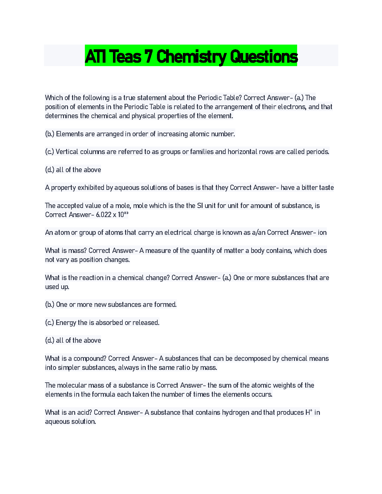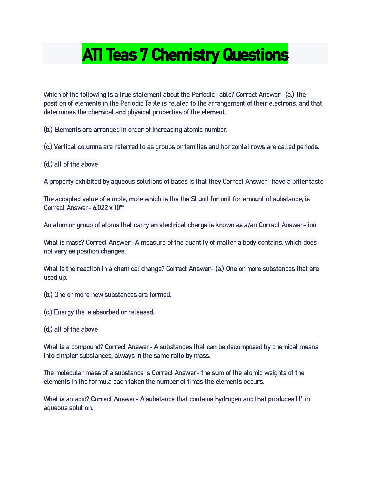 ATI Teas 7 Chemistry Questions and Verified and Updated Answers 2023/2024