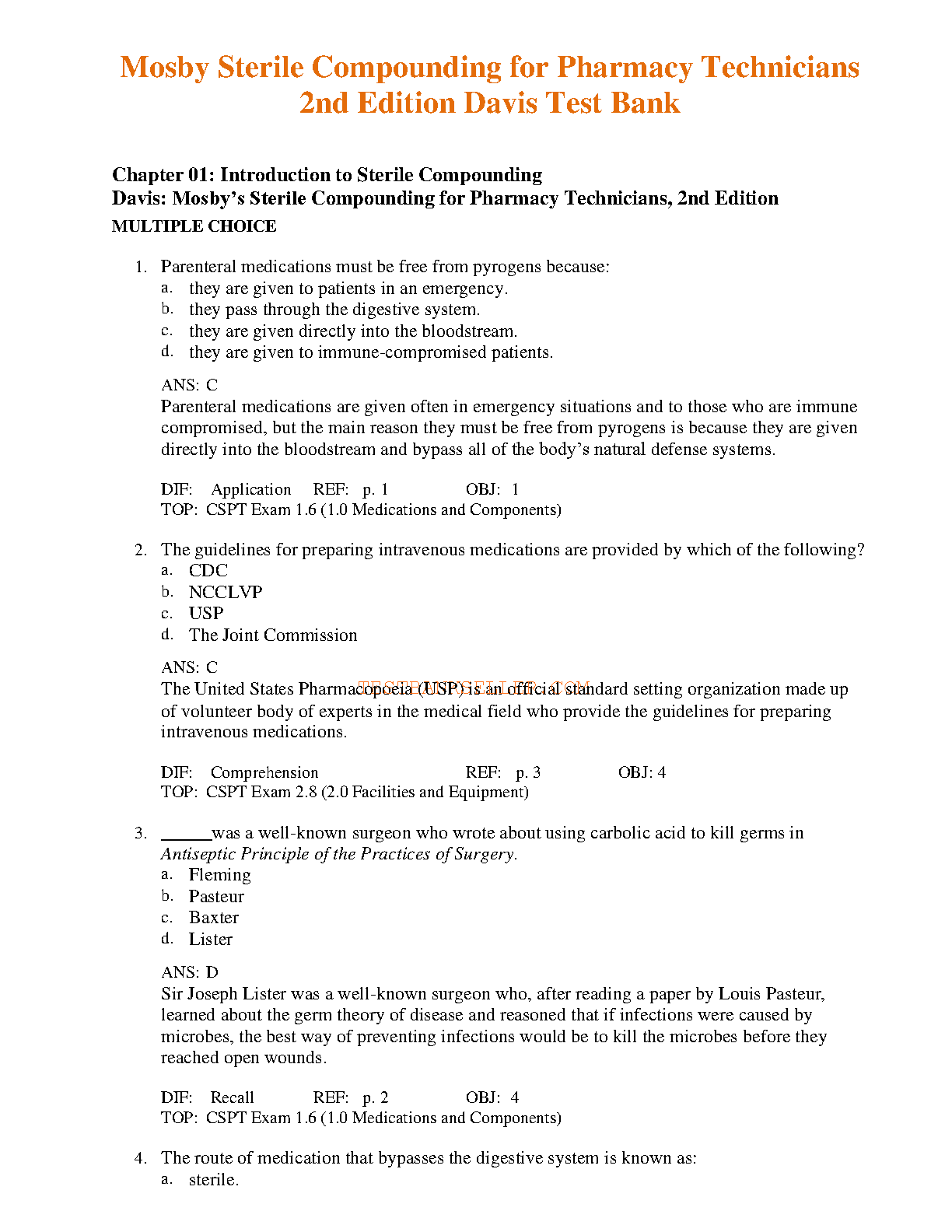 Test Bank for Davis: Mosby’s Sterile Compounding for Pharmacy Technicians, 2nd Edition. DOWNLOAD on www.hackedexams.com INSTANTLY.