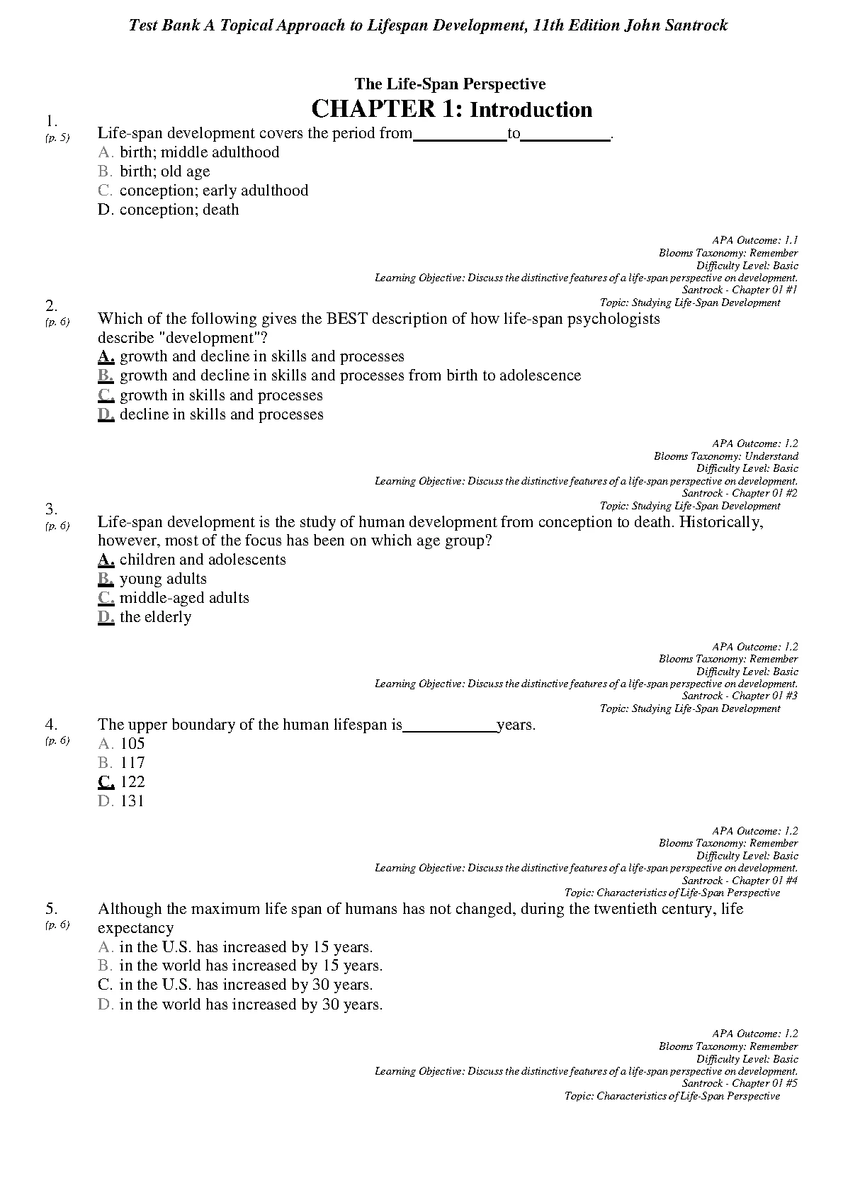 TEST BANK A Topical Approach to Lifespan Development, 11th Edition John Santrock