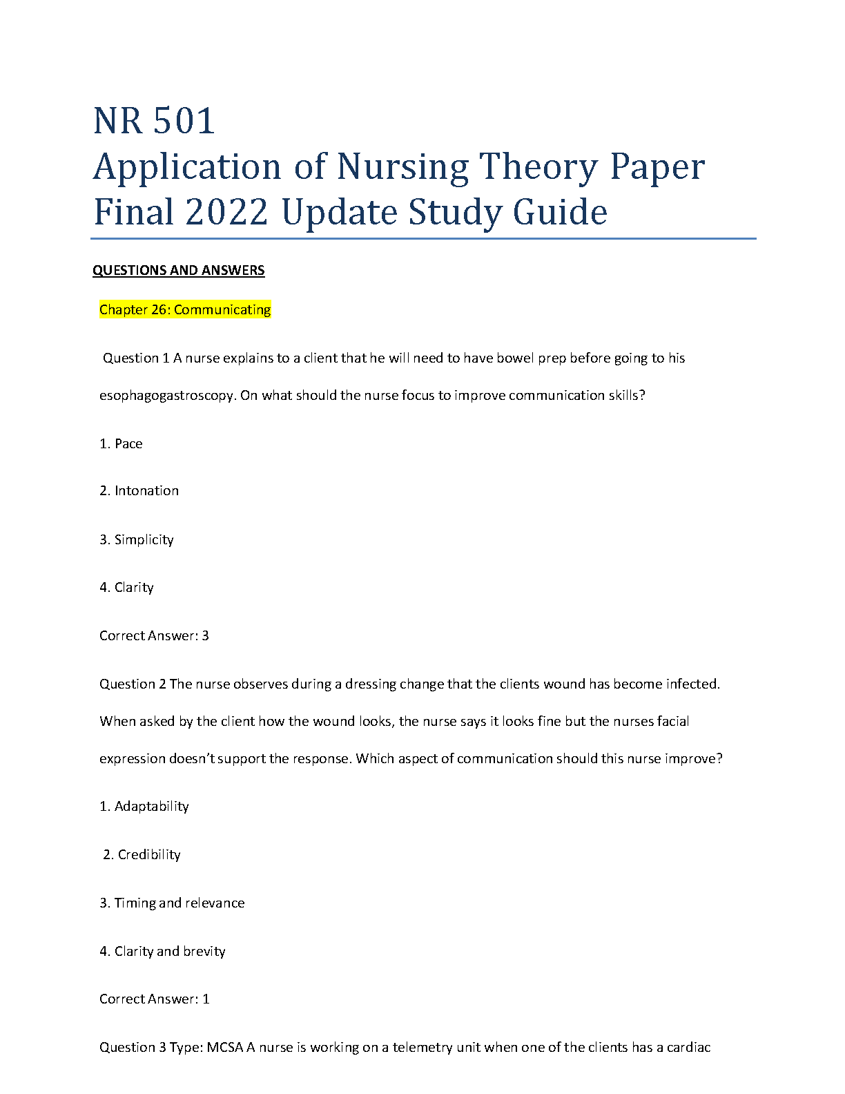 Ace your NR 501 final exam with this comprehensive study guide featuring 2022 updated questions and answers. This guide covers key concepts from the Application of Nursing Theory course, focusing on essential topics to ensure your success on the first attempt, and avoid resits.
