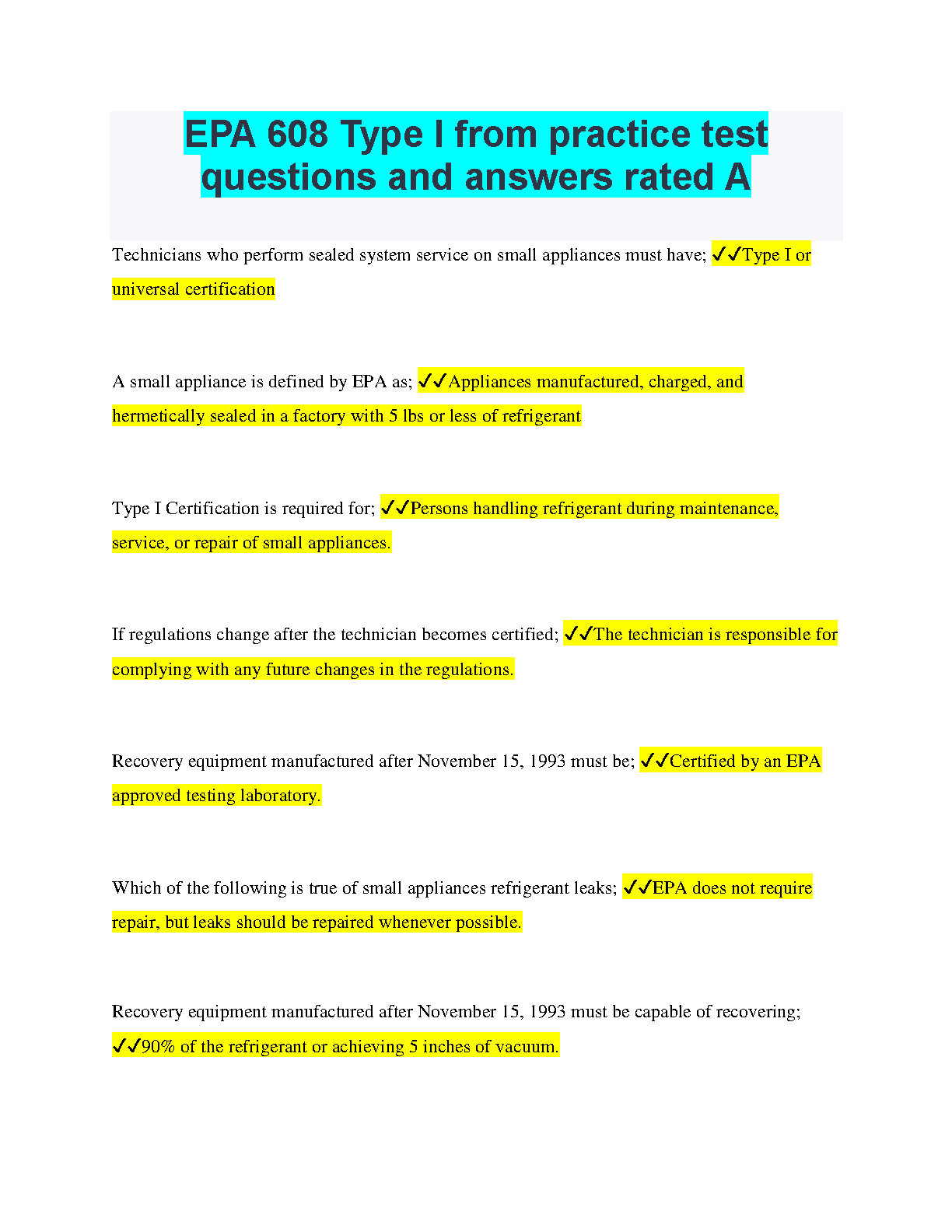 EPA 608 Type 1 Practice Test Questions & Answers for 2024/2025 - Pass Your Exam On The First Attempt
