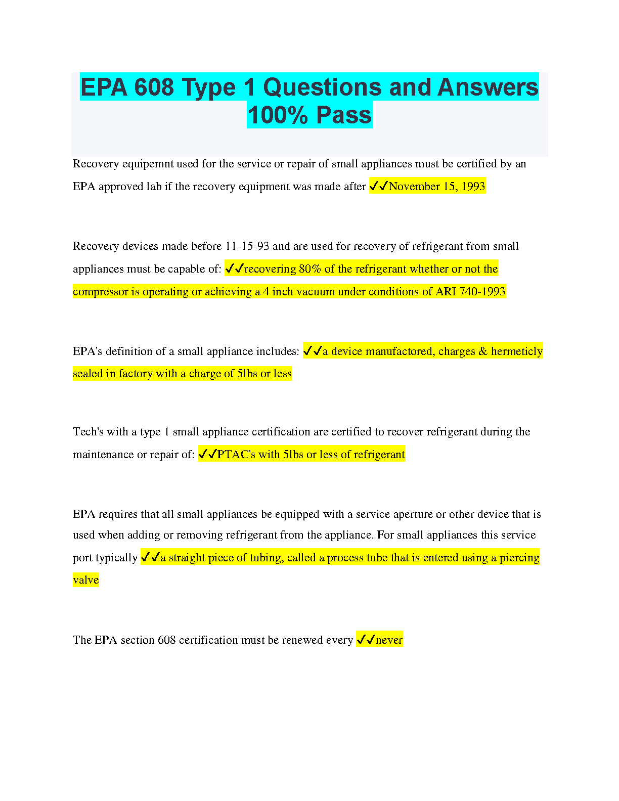 EPA 608 Type 1 Questions and Answers: 100% Pass - Study Guide for 2024/2025 Exam Success