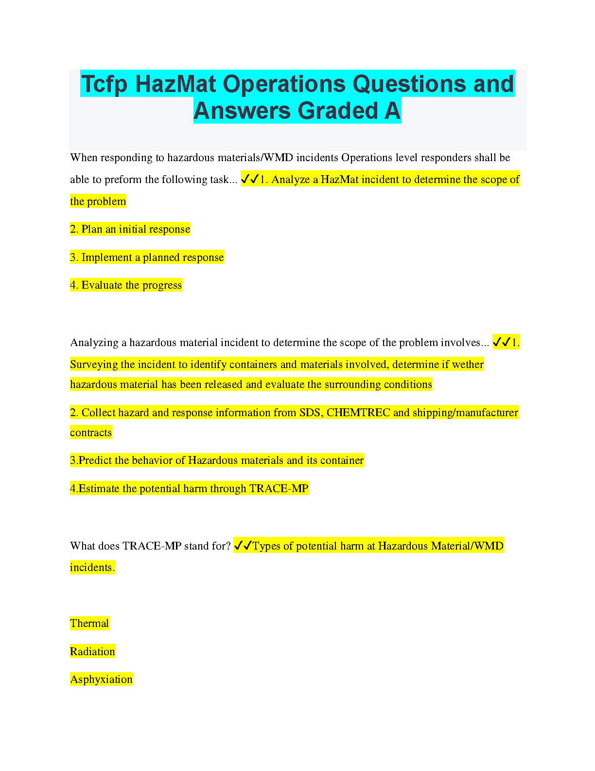 Prepare for your HazMat Operations exams with this comprehensive set of graded questions and answers. This resource covers all the essential topics and concepts needed to succeed on your first attempt, helping you avoid costly resits.