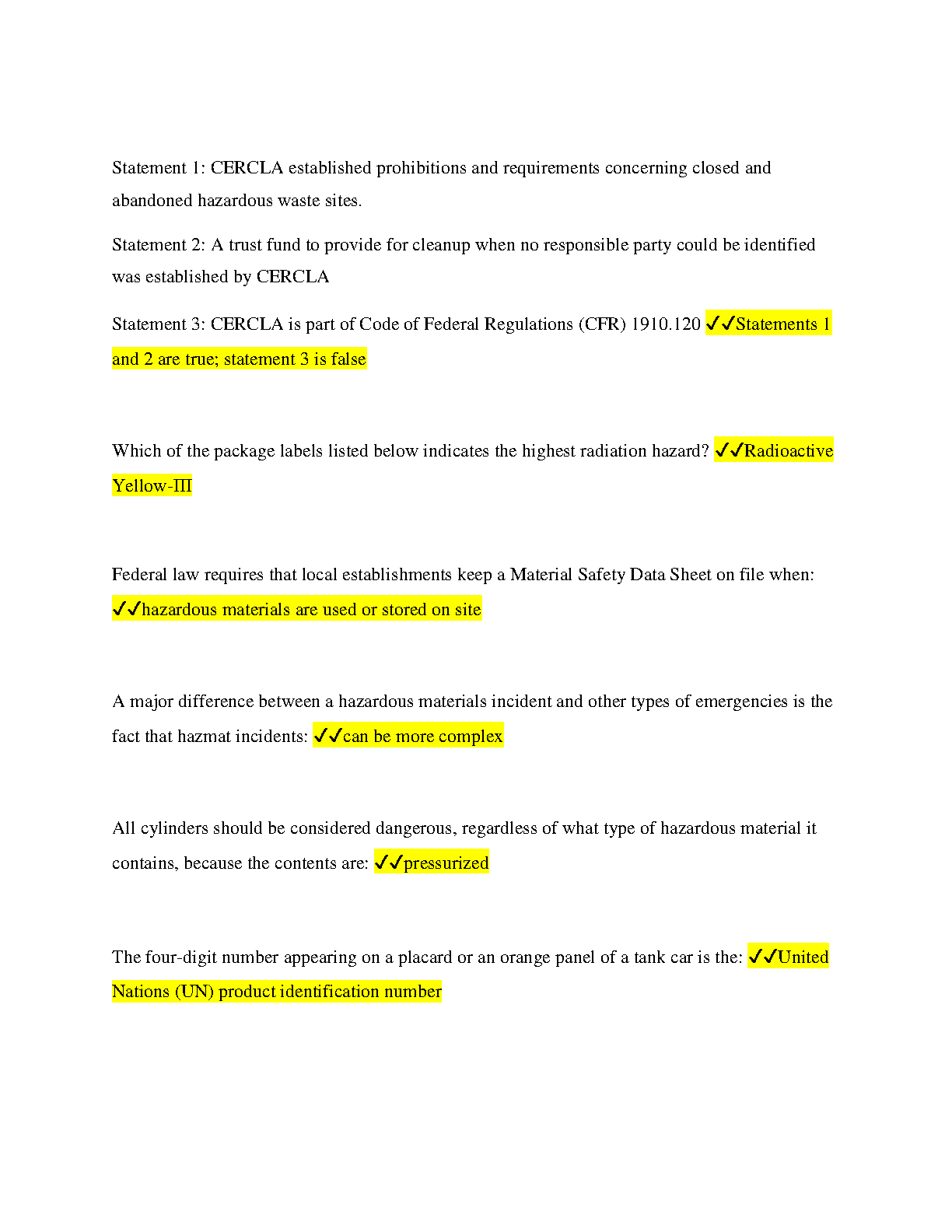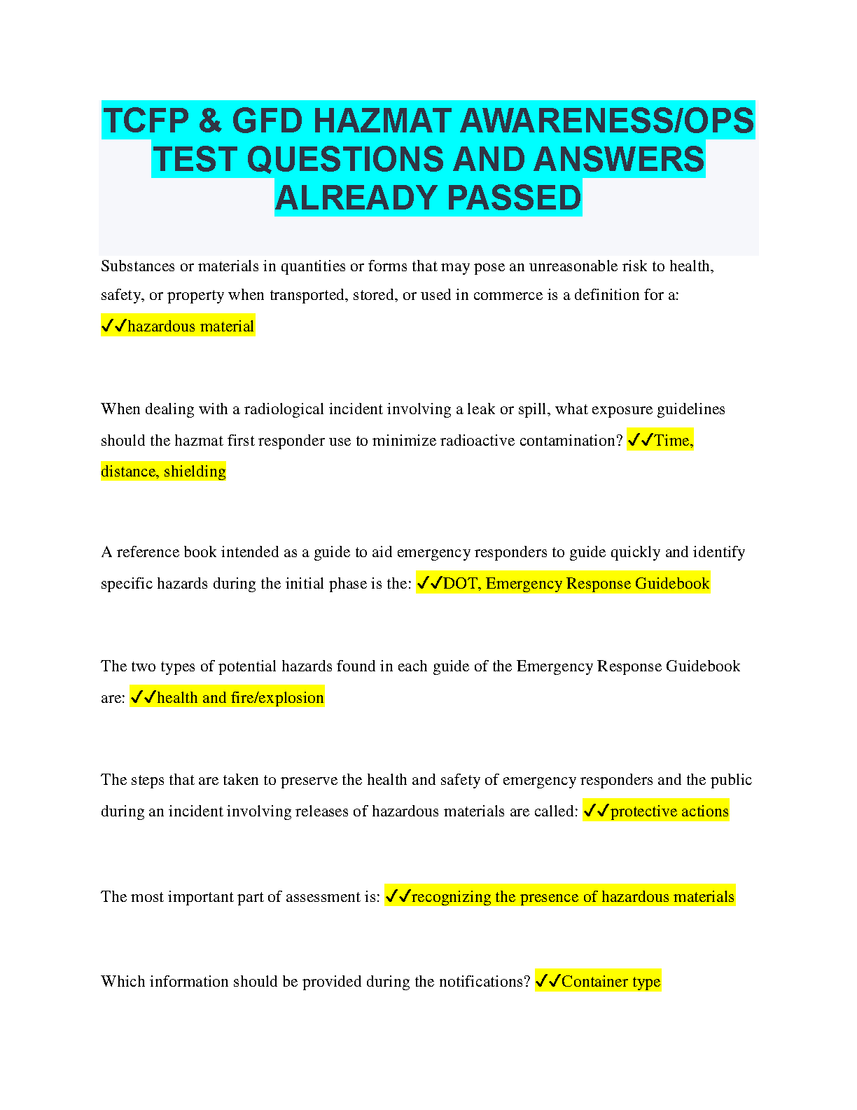 TCFP & GFD HAZMAT AWARENESS/OPS TEST QUESTIONS AND ANSWERS ALREADY PASSED