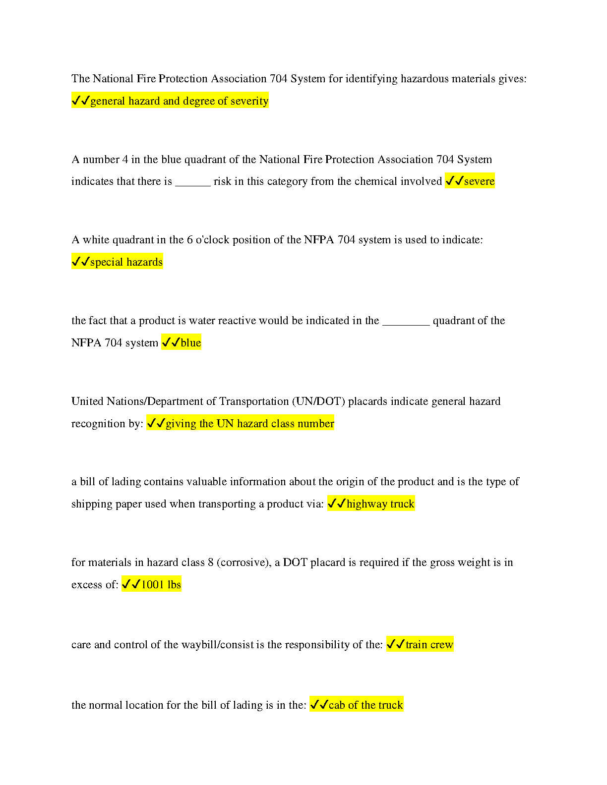 Get ready to ace your Hazmat Awareness/Ops test with this comprehensive collection of questions and answers. Covering key concepts and scenarios, this resource helps you understand the crucial aspects of hazmat safety, response, and incident management. This comprehensive guide provides you with the knowledge and confidence to pass your exam and ensure your preparedness in emergency situations.