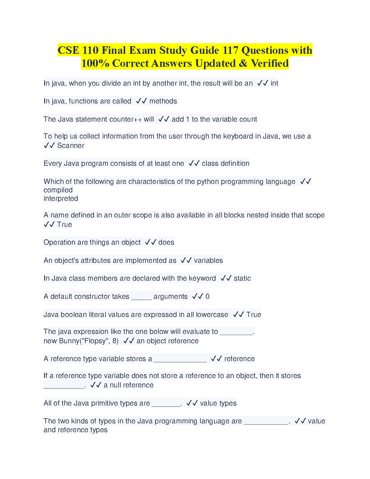 Ace your CSE 110 final exam on the first attempt with this comprehensive study guide featuring 117 questions with 100% correct answers. Covering all essential concepts, this updated and verified resource provides an effective way to master the material and avoid resits.