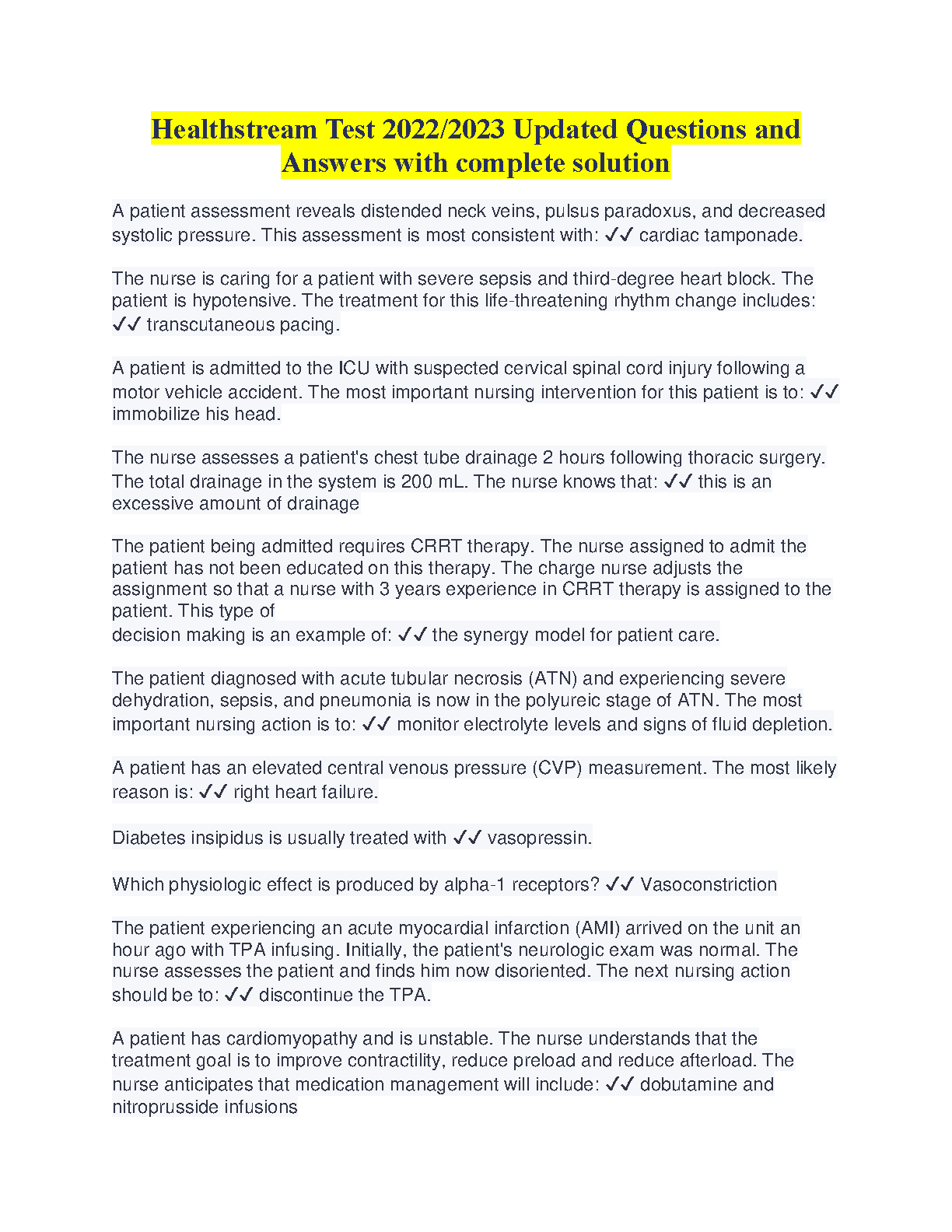 Looking for the best way to ace your Nursing Exam on the first attempt? Look no further than this comprehensive Healthstream Test 2022/2023 updated question bank with complete solutions. This resource is designed to help you master the most relevant nursing concepts and prepare for a successful exam experience.
