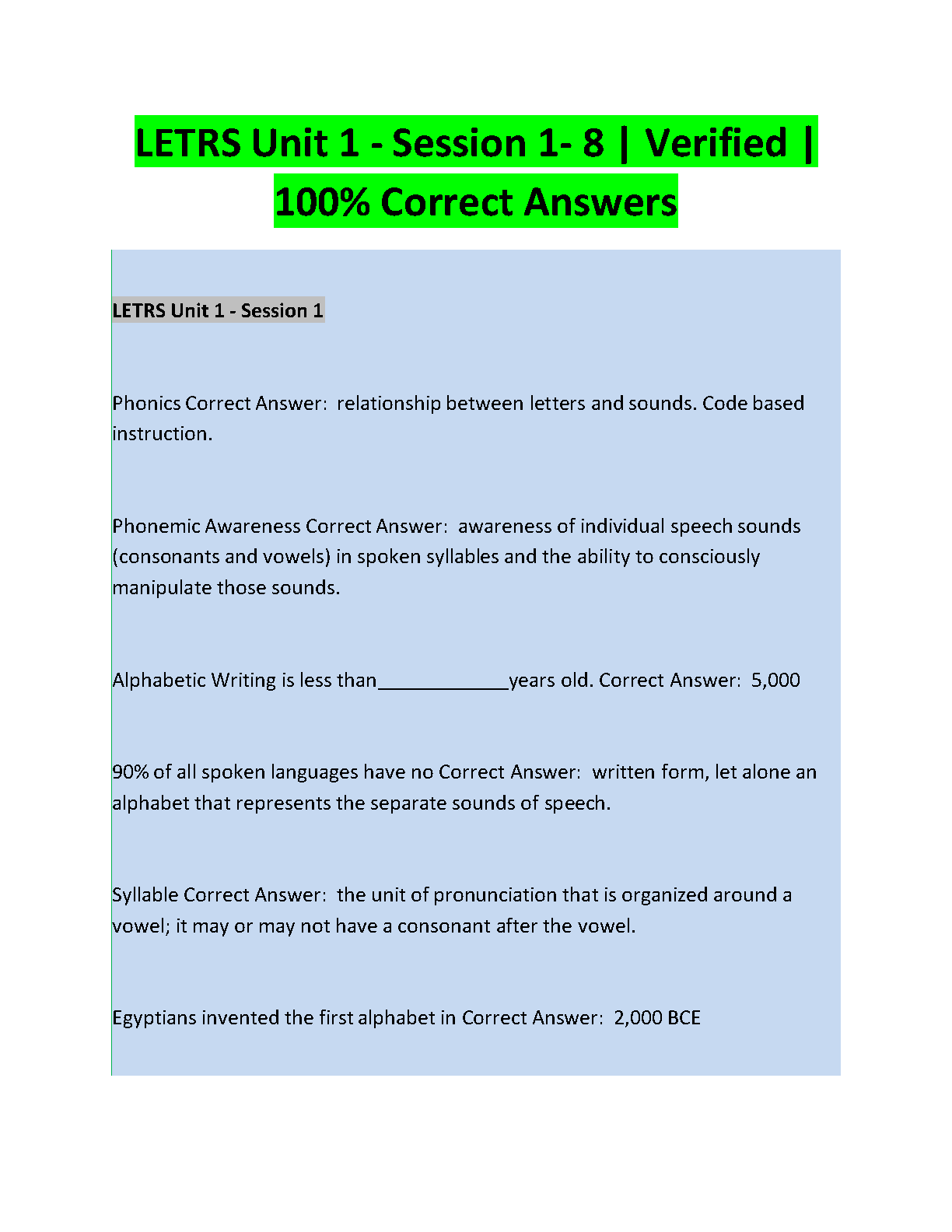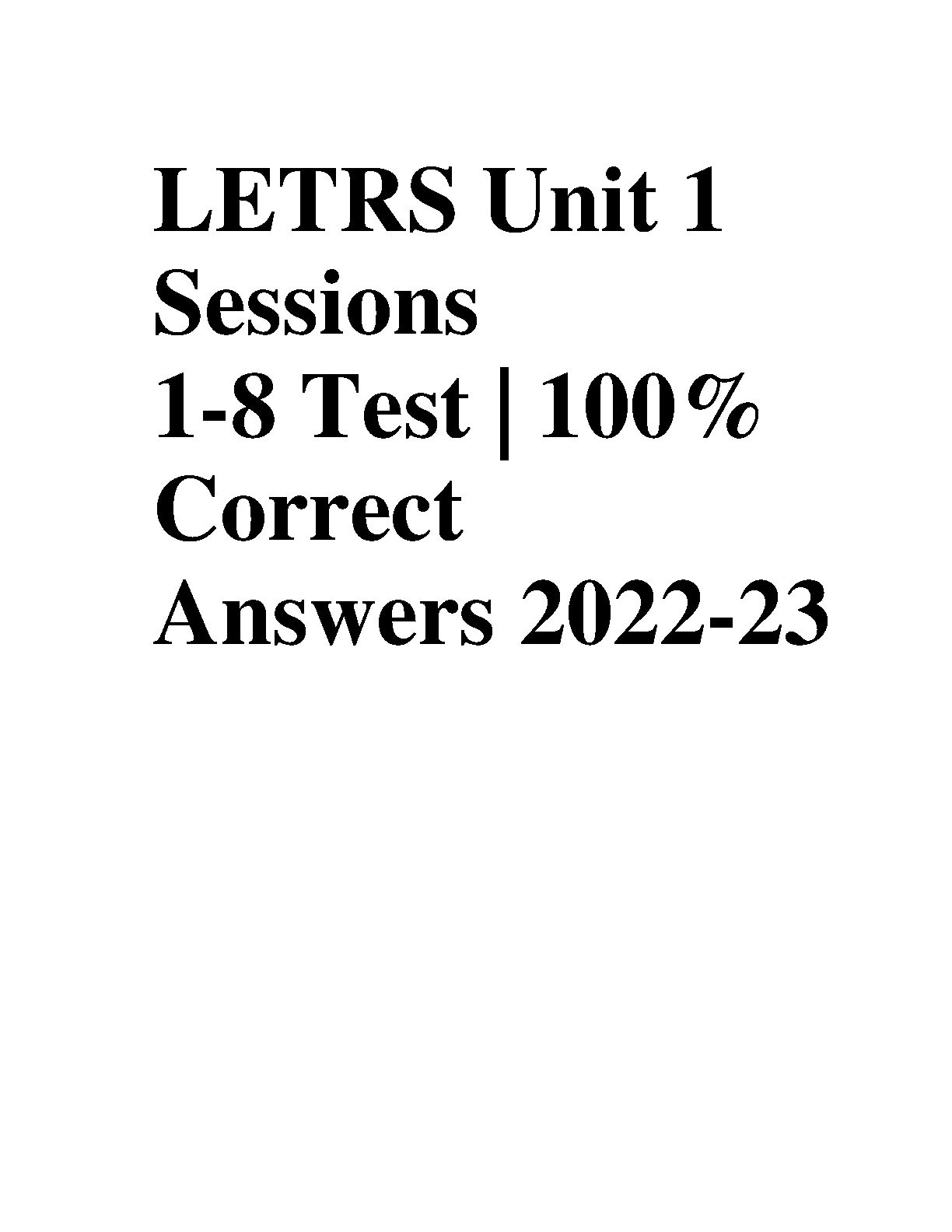 LETRS Unit 1 Sessions 1-8 Test 100% Correct Answers 2022-23 - This resource contains the correct answers to the LETRS Unit 1 Sessions 1-8 Test, designed to help you achieve a perfect score and avoid resits.