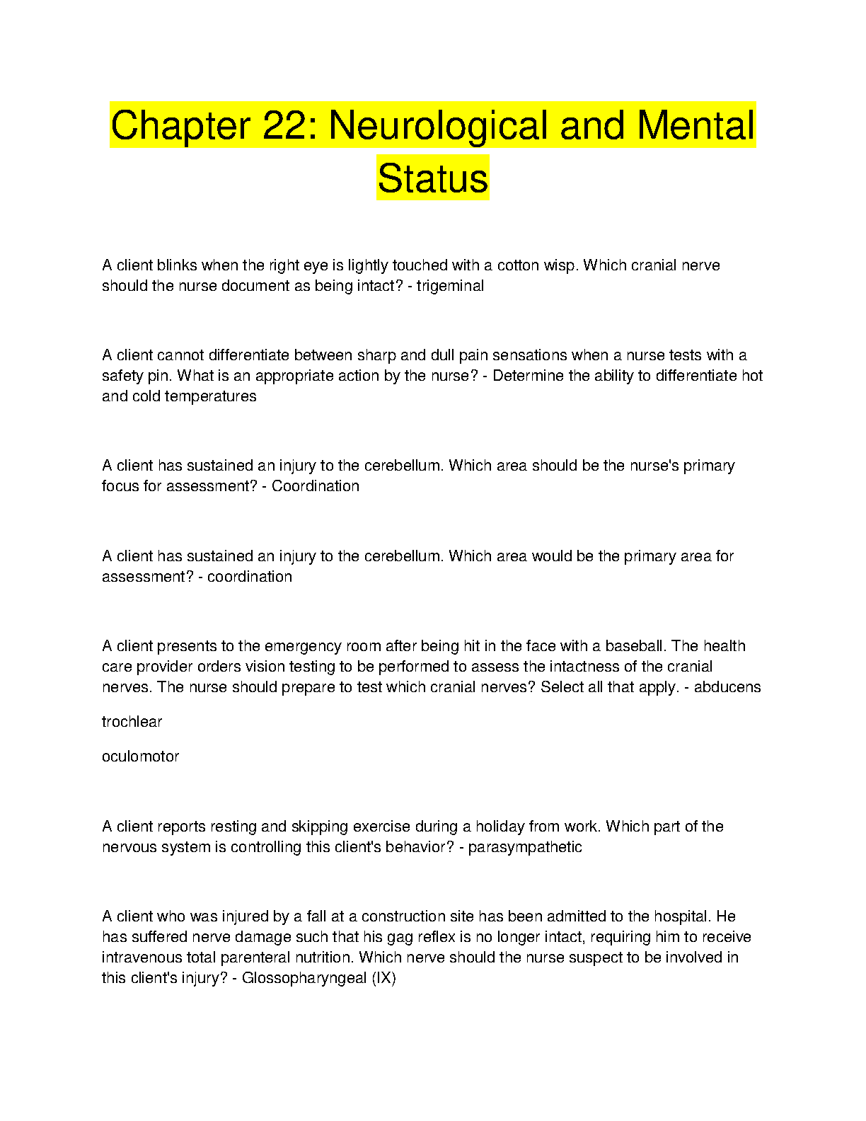 This study guide provides a comprehensive overview of neurological and mental status assessment in nursing. It covers key concepts, essential procedures, and real-world examples to ensure you master the subject. Use this resource to ace your exams on the first attempt and avoid resits.
