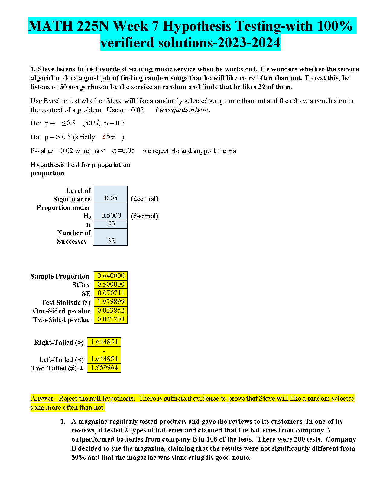 Ace your MATH 225N course with this comprehensive solution manual, offering 100% accurate, step-by-step solutions for Week 7: Hypothesis Testing. Avoid resits and achieve academic excellence with this essential resource for 2023-2024.