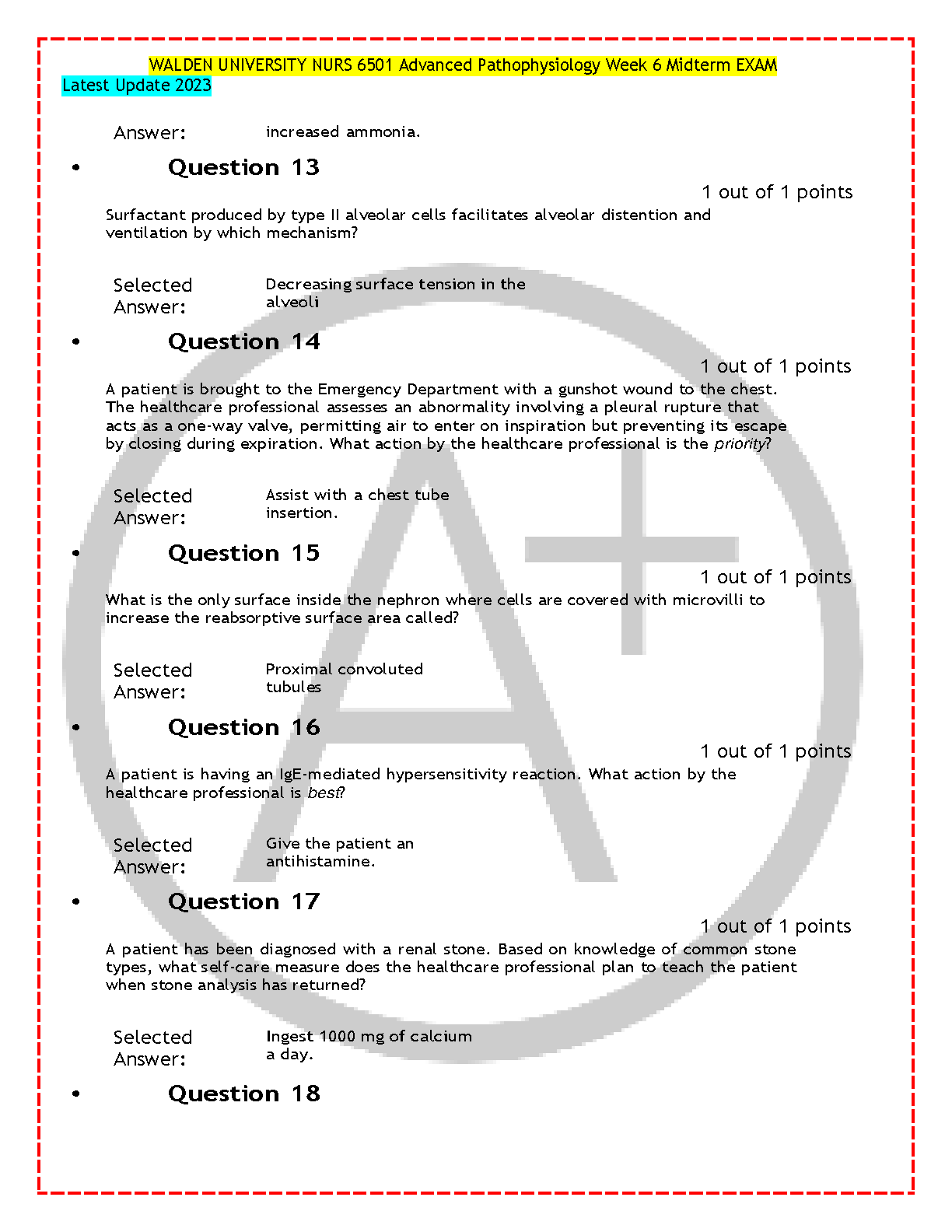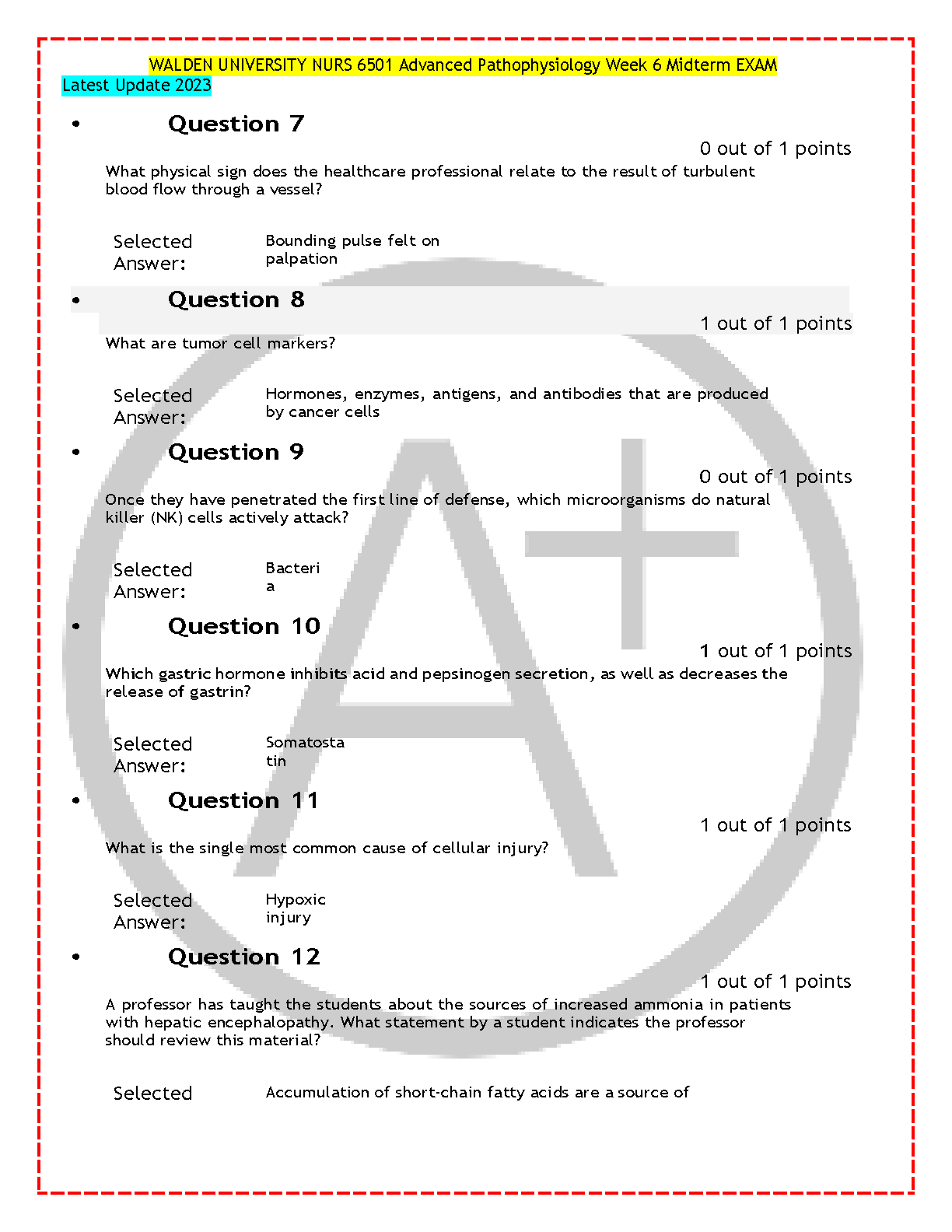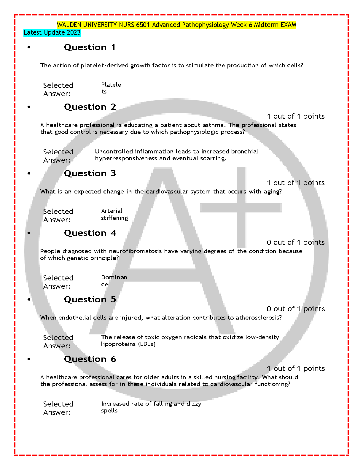Ace your Walden University NURS 6501 Advanced Pathophysiology Week 6 Midterm Exam with this comprehensive study guide. Our expert team has compiled a complete set of exam questions and answers, aligned with the latest 2023 syllabus. Gain confidence and avoid resits with our detailed explanations and insights.