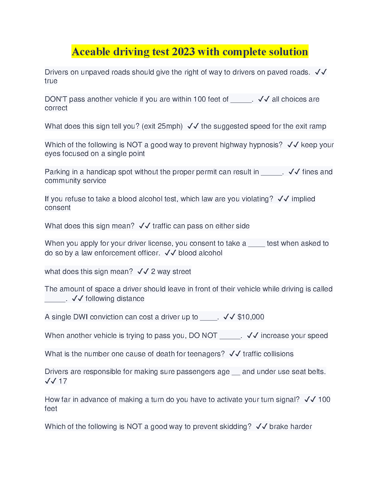 Aceable Driving Test 2023 with Complete Solutions is a comprehensive resource designed to help students ace their driving test on the first attempt, minimizing the risk of resits. This invaluable guide provides answers to all the questions you might encounter in your driving test, covering essential topics such as road rules, traffic signs, safe driving practices, and more. It's an excellent tool for anyone preparing for their driving test, enabling them to gain confidence and knowledge, thereby maximizing their chances of success.