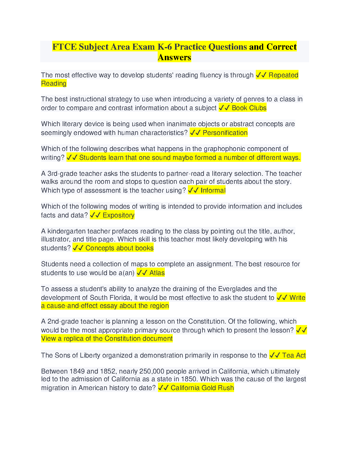 FTCE Subject Area Exam K-6 Practice Questions and Correct Answers - 2024/2025 Edition: Your Guide to Passing on the First Attempt