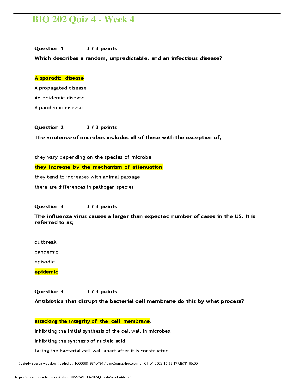 This BIO 202 Quiz 4 - Week 4 is designed to help students pass their exam on the first attempt. It covers topics such as the virulence of microbes, the mechanism of attenuation, and the effect of antibiotics on bacterial cell membranes.
