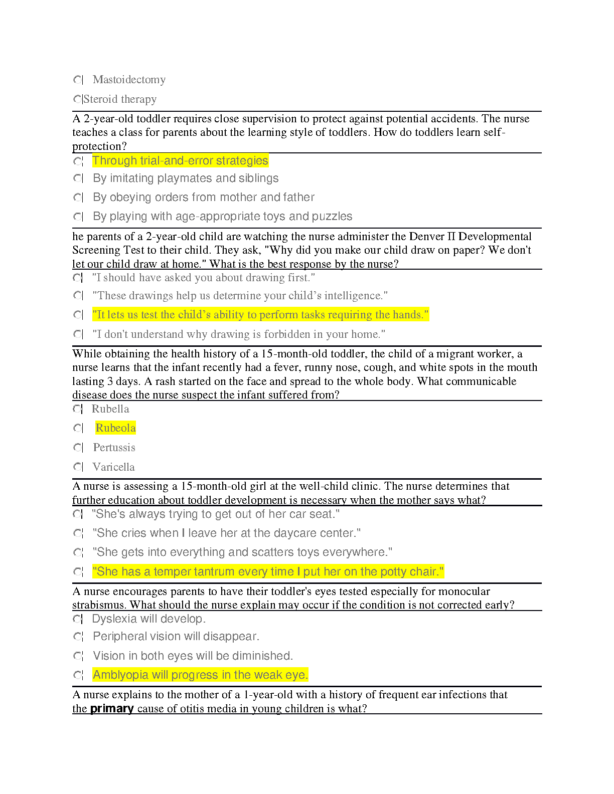 This NUR 1102 Toddler EAQ guide is designed to equip you with the knowledge and practice needed to excel in your nursing exams. Our comprehensive resource features detailed explanations, practice questions, and insightful tips, making it an indispensable tool for students striving for first-attempt success. This is your ultimate companion for tackling challenging concepts and mastering the intricacies of toddler development, ensuring a smooth path towards a successful nursing career.