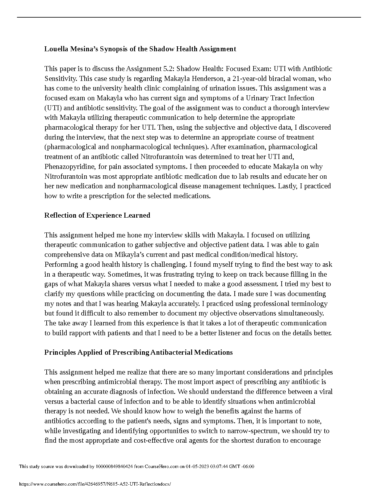 Louella Mesina's Synopsis of the Shadow Health Assignment 5.2: Shadow Health: Focused Exam: UTI with Antibiotic Sensitivity - 2024/2025 Edition
