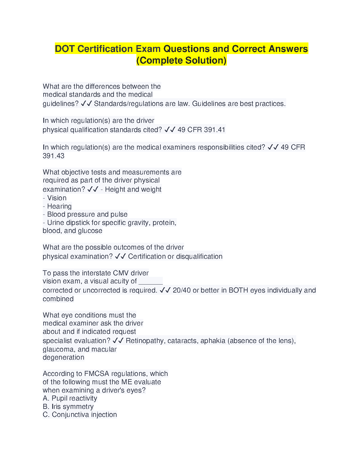 DOT Certification Exam Questions and Correct Answers (Complete Solution) 2024/2025 Edition
