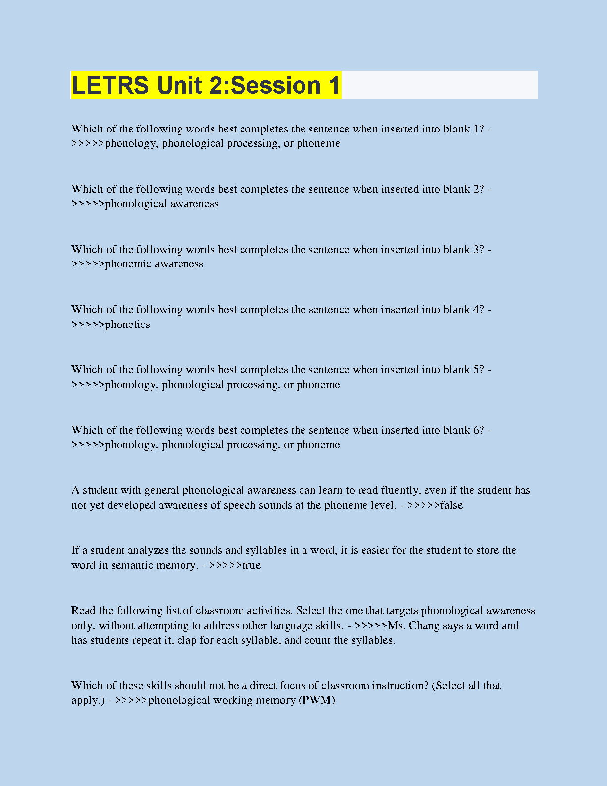 This valuable resource is designed to help students pass LETRS Unit 2: Session 1 on their first attempt, ensuring they avoid resits. It provides a thorough understanding of crucial concepts related to phonological awareness and reading instruction.