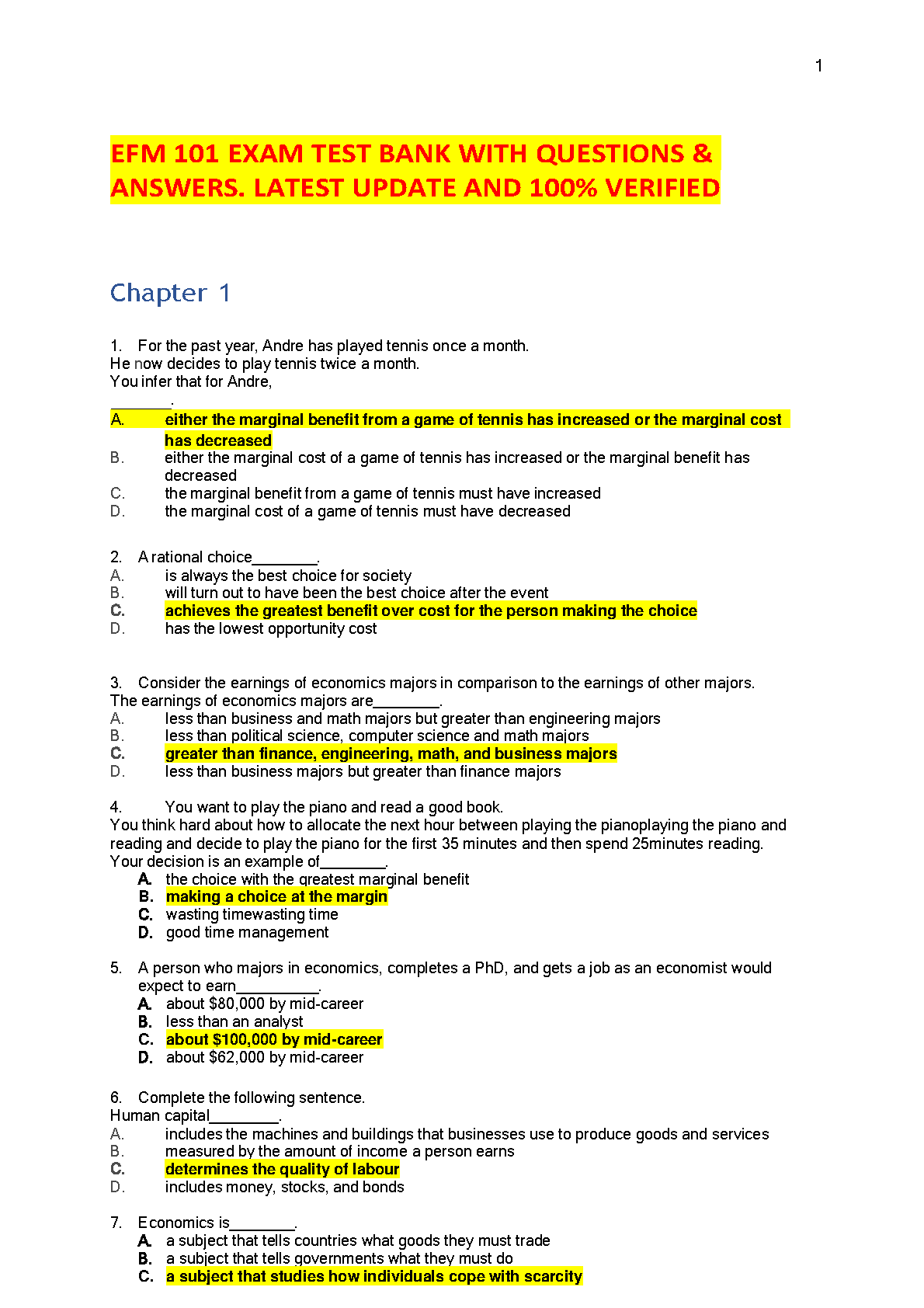 EFM 101 Exam Test Bank with Questions & Answers - Latest Edition (2024/2025) - by [Author's Name]