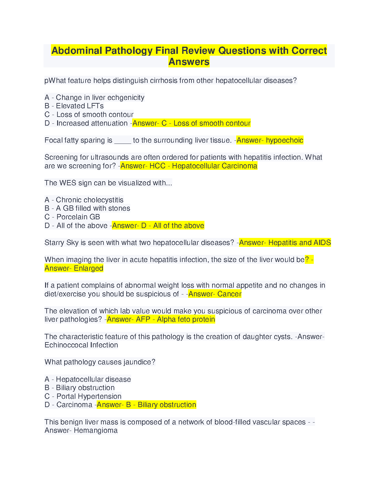 Abdominal Pathology Final Review Questions with Correct Answers - Latest Edition 2024/2025