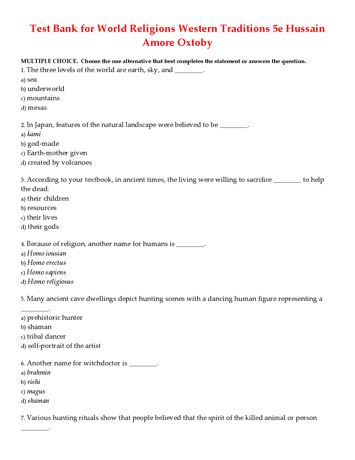 Ace your World Religions Western Traditions course with this comprehensive Test Bank for the 5th Edition by Hussain Amore Oxtoby. This resource contains a wealth of practice questions and answers, designed to help you master the key concepts and prepare for exams with confidence.